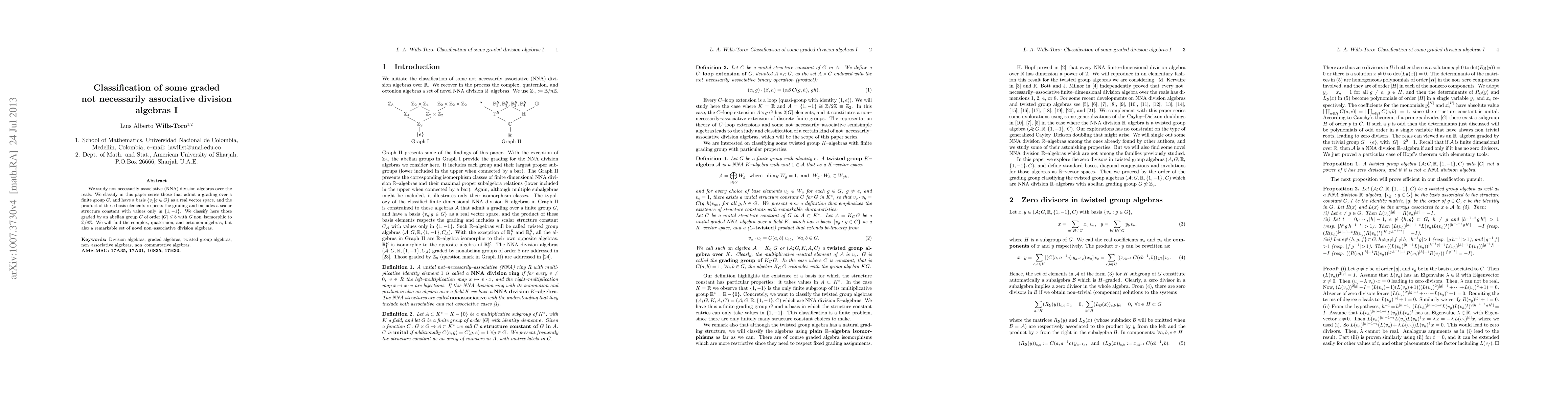 We study not necessarily associative (NNA) division algebras over the reals. We classify in this paper series those that admit a grading over a finite group $G$, and have a basis $\{v_g|g\in G\}$ as a real vector space, and the product of these basis elements respects the grading and includes a scalar structure constant with values only in $\{1,-1\}$. We classify here those graded by an abelian group $G$ of order $|G|\leq 8$ with $G$ non--isomorphic to $\z/8\z$. We will find the complex, quaternion, and octonion algebras, but also a remarkable set of novel non--associative division algebras.