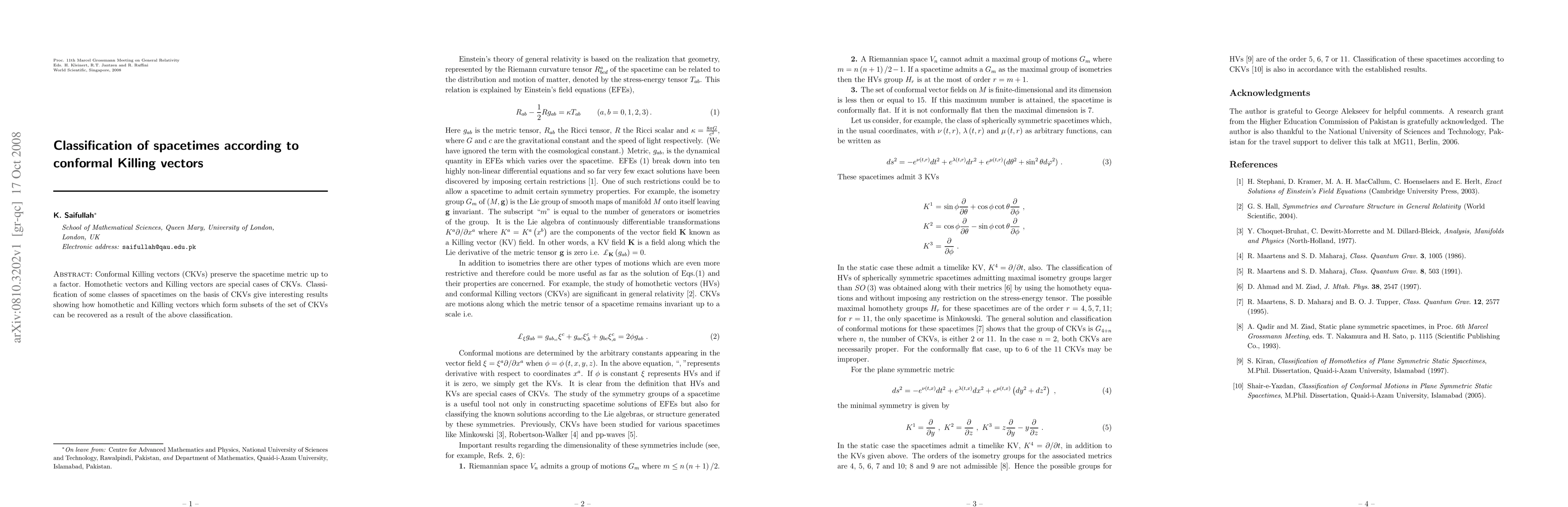 This paper classifies various spacetimes using conformal Killing vectors (CKVs), which preserve the metric up to a scaling factor. It reveals that homothetic and Killing vectors, subsets of CKVs, can be identified through this classification process.