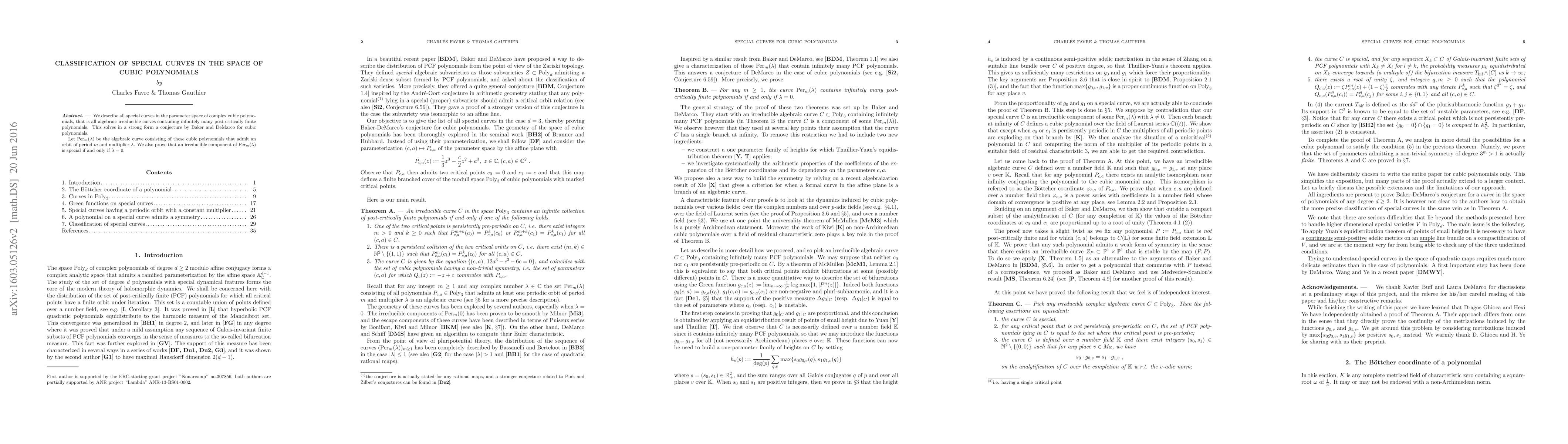 We describe all special curves in the parameter space of complex cubic polynomials, that is all algebraic irreducible curves containing infinitely many post-critically finite polynomials. This solves in a strong form a conjecture by Baker and DeMarco for cubic polynomials. We also prove that an irreducible component of the algebraic curve consisting of those cubic polynomials that admit an orbit of any given period and given multiplier is special if and only if the multiplier is 0.
