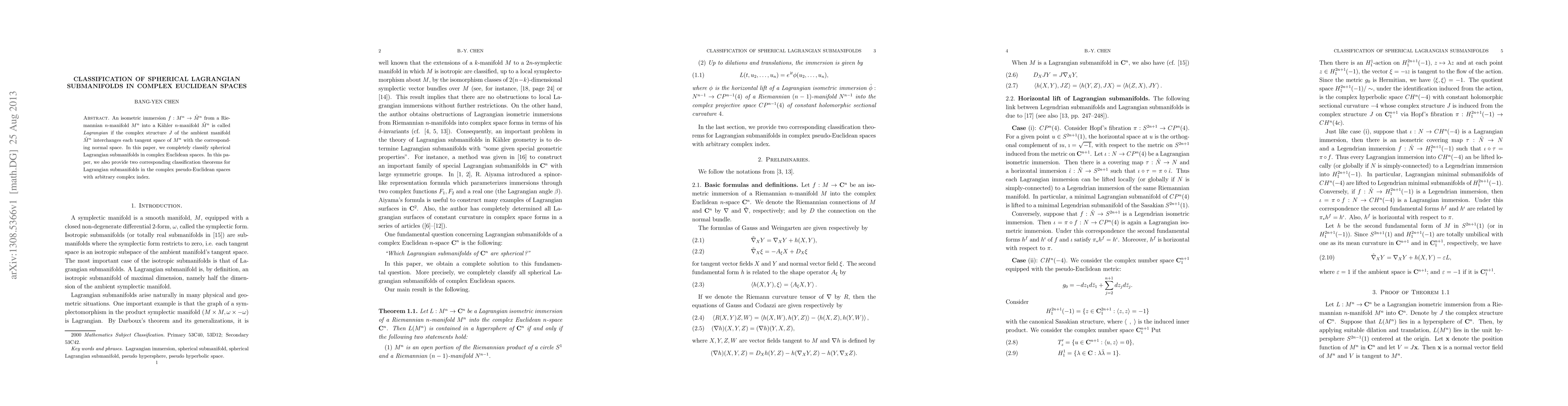This paper classifies spherical Lagrangian submanifolds in complex Euclidean spaces and provides classification theorems for Lagrangian submanifolds in complex pseudo-Euclidean spaces with any complex index, revealing the interplay between the complex structure and the geometry of the submanifolds.