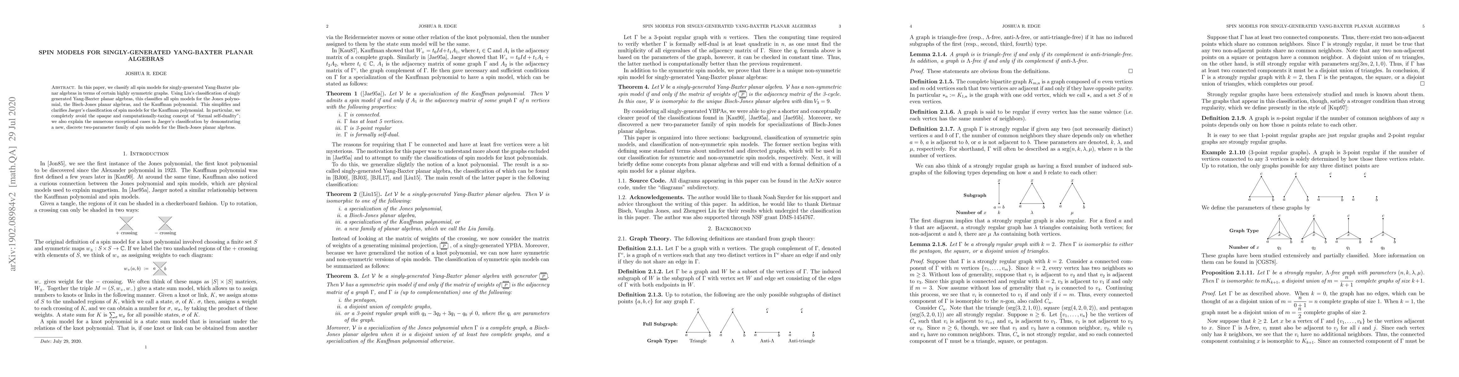 In this paper, we classify all spin models for singly-generated Yang-Baxter planar algebras in terms of certain highly regular graphs. Using Liu's classification of singly generated Yang-Baxter planar algebras, this classifies all spin models for the Jones polynomial, the Bisch-Jones planar algebras, and the Kauffman polynomial. This simplifies and clarifies Jaeger's classification of spin models for the Kauffman polynomial. In particular, we completely avoid the opaque and computationally-taxing concept of "formal self-duality"; we also explain the numerous exceptional cases in Jaeger's classification by demonstrating a new, discrete two-parameter family of spin models for the Bisch-Jones planar algebras.