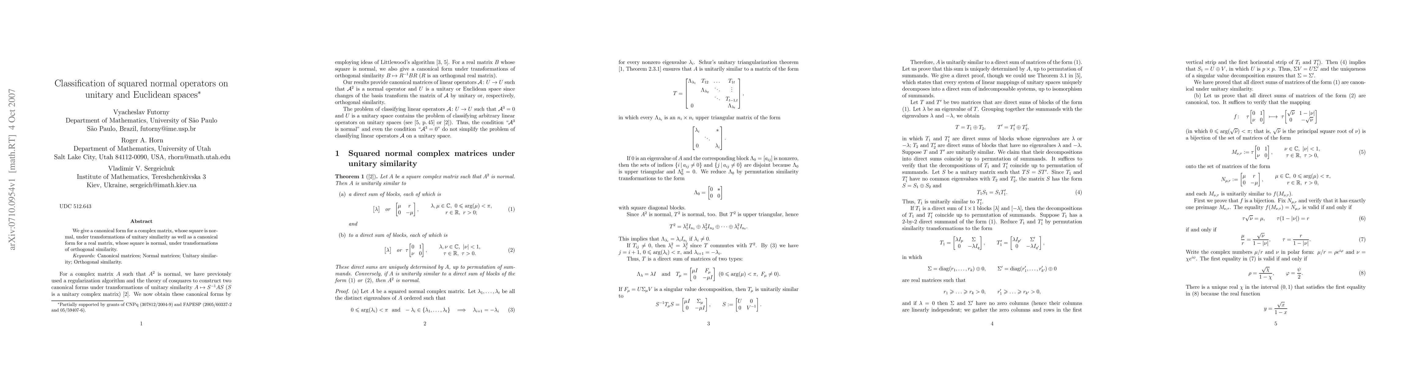 Summary: This paper provides canonical forms for complex and real matrices where the square is normal, under unitary and orthogonal similarity transformations respectively, classifying squared normal operators in complex and real spaces.