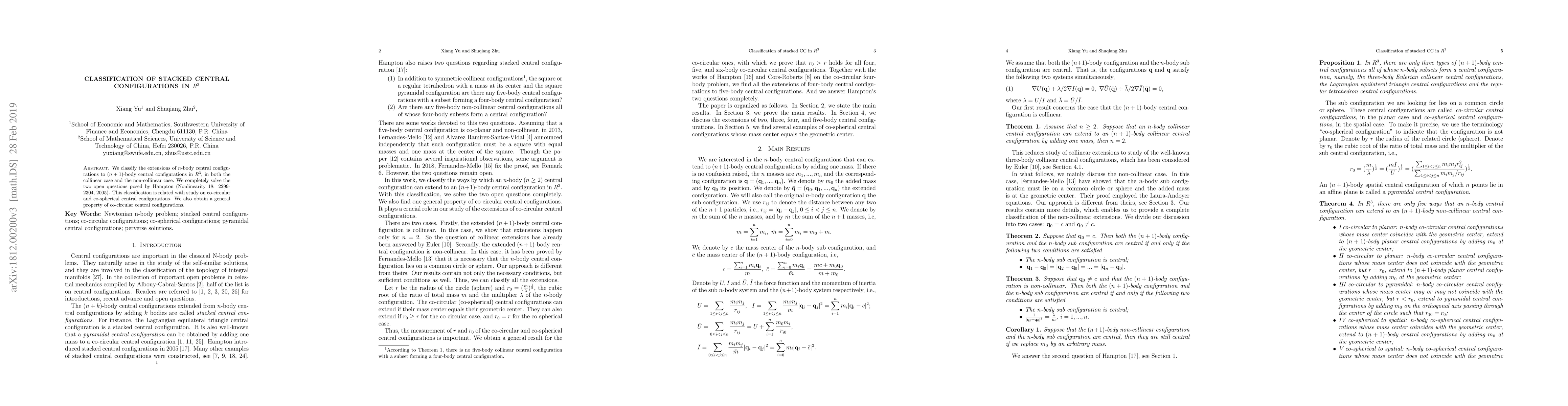 We classify the extensions of n-body central configurations to (n + 1)-body central configurations in R3, in both the collinear case and the non-collinear case. We completely solve the two open questions posed by Hampton (Nonlinearity 18: 2299- 2304, 2005). This classification is related with study on co-circular and co-spherical central configurations. We also obtain a general property of co-circular central configurations.