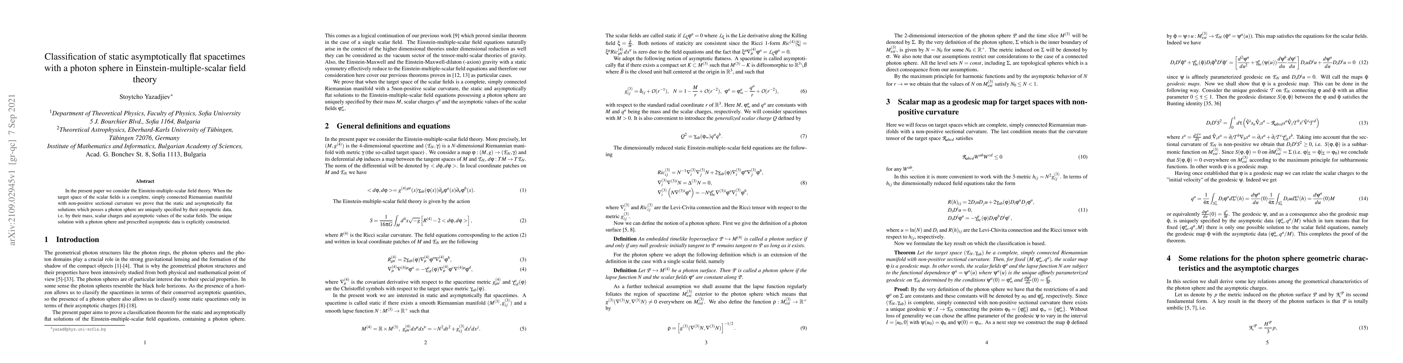 This paper classifies static and asymptotically flat solutions in Einstein-multiple-scalar field theory with a photon sphere, proving that such solutions are uniquely determined by their mass, scalar charges, and asymptotic scalar field values. An explicit construction of the unique solution with a photon sphere is provided.
