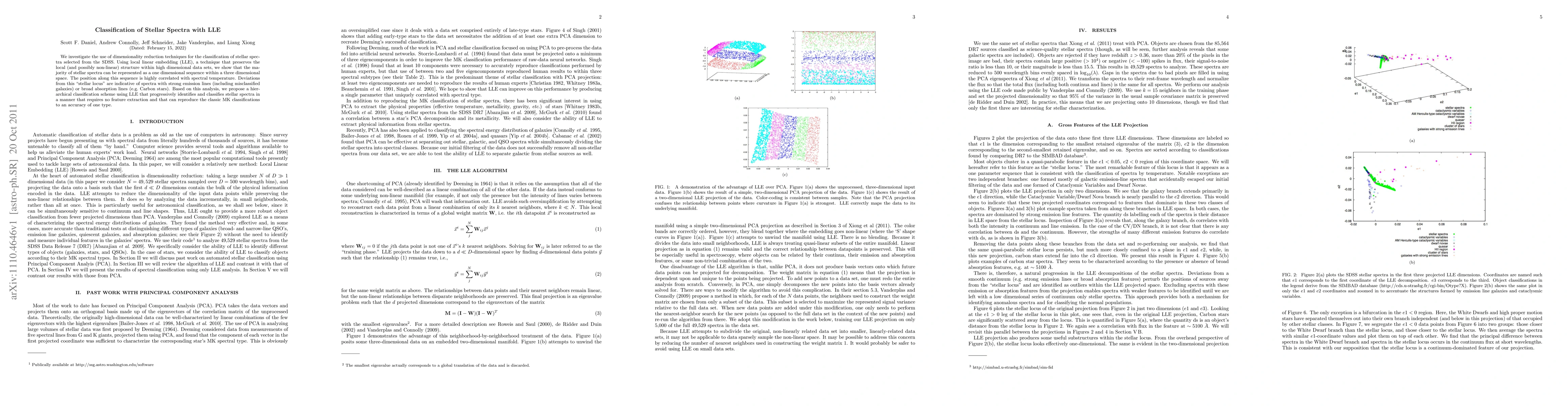 Researchers used LLE to reduce dimensionality of stellar spectra from SDSS, finding that most can be represented on a 1D sequence in 3D space with temperature correlation, distinguishing between stars and galaxies.