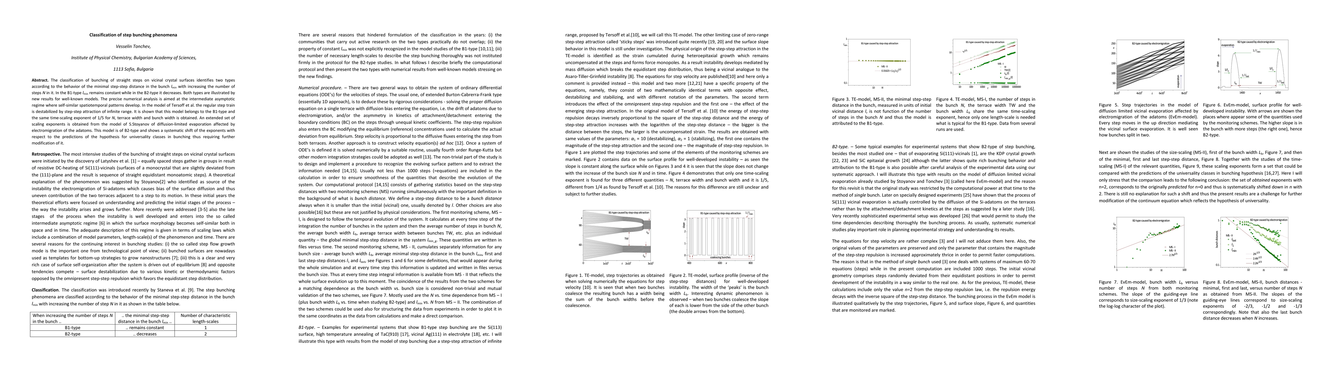This paper classifies step bunching phenomena on crystal surfaces into two types: B1, where minimal step-step distance remains constant, and B2, where it decreases. The B1-type is exemplified by the Tersoff model, while the B2-type is illustrated by the S. Stoyanov model, showing deviations from universality class predictions.