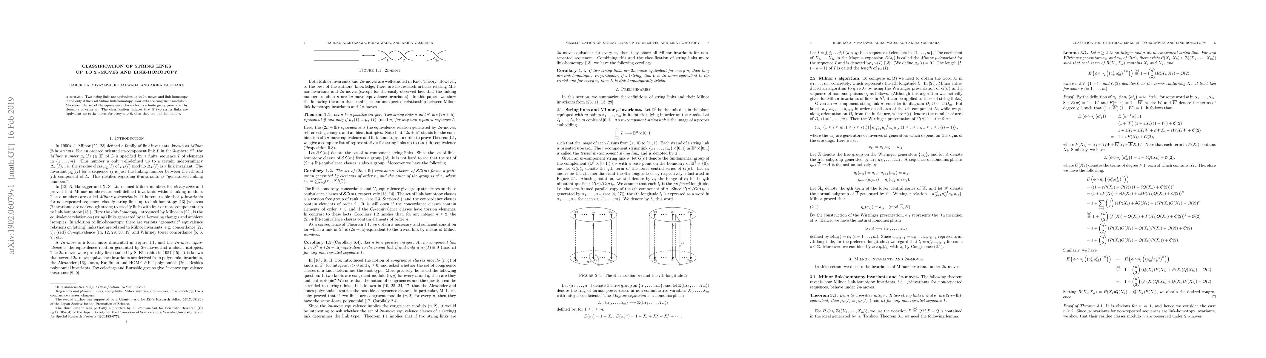 This paper classifies string links up to $2n$-moves and link-homotopy, showing that equivalence depends on congruence of Milnor link-homotopy invariants modulo $n$. It concludes that string links equivalent under all $2n$-moves for any $n$ are link-homotopic.