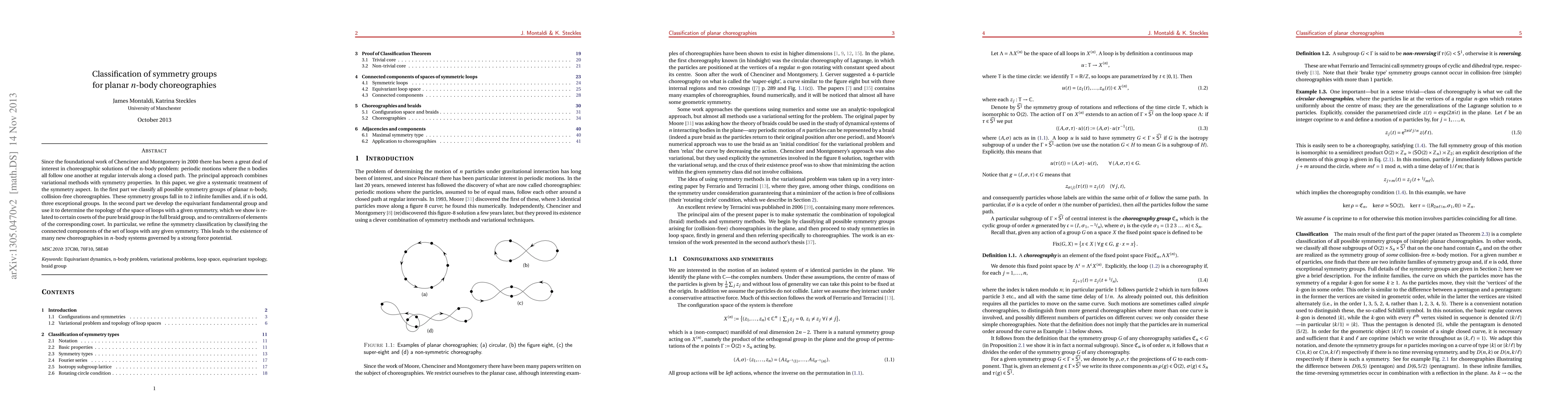 This paper systematically classifies the symmetry groups for planar n-body choreographies, identifying two infinite families and three exceptional groups when n is odd. It also develops the equivariant fundamental group to refine the classification and determine the topology of the space of loops with given symmetries, leading to the discovery of new choreographies in n-body systems.