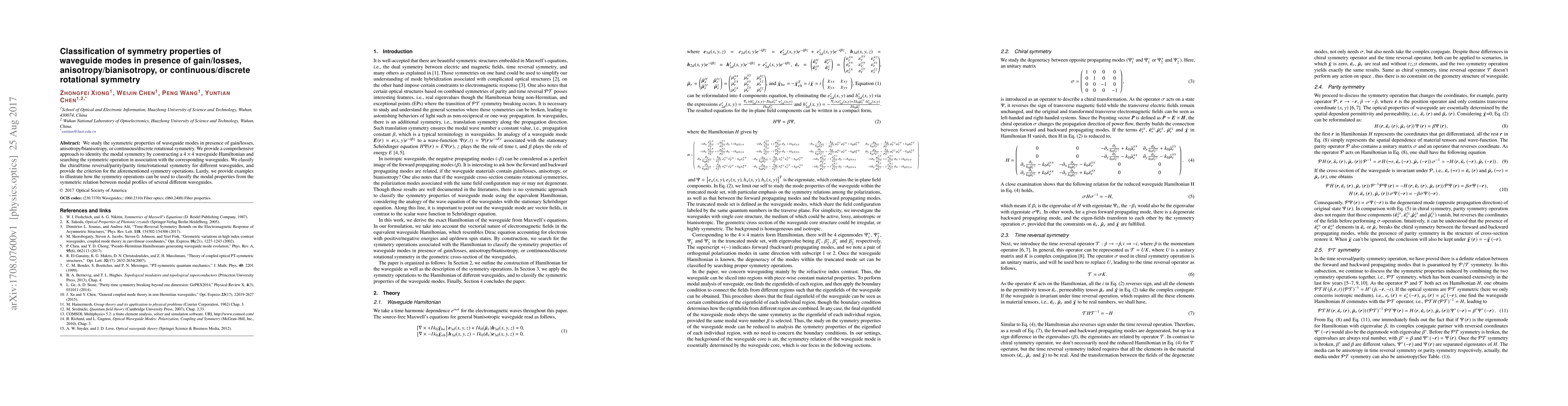 We study the symmetric properties of waveguide modes in presence of gain/losses, anisotropy/bianisotropy, or continuous/discrete rotational symmetry. We provide a comprehensive approach to identity the modal symmetry by constructing a $4\times4$ waveguide Hamiltonian and searching the symmetric operation in association with the corresponding waveguides. We classify the chiral/time reversal/parity/parity time/rotational symmetry for different waveguides, and provide the criterion for the aforementioned symmetry operations. Lastly, we provide examples to illustrate how the symmetry operations can be used to classify the modal properties from the symmetric relation between modal profiles of several different waveguides.
