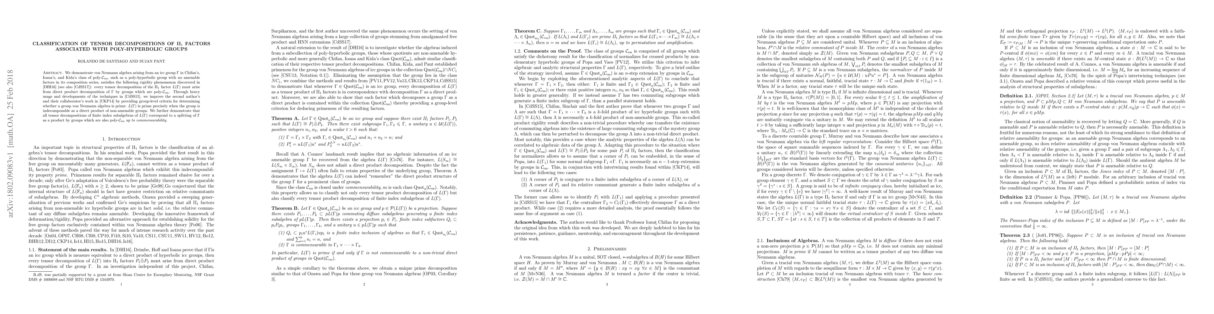 This paper demonstrates that tensor decompositions of II$_1$ factors from poly-hyperbolic groups without amenable factors exhibit rigidity, mirroring direct product decompositions of the group itself. It provides group-level criteria for determining the primality of group von Neumann algebras and shows that finite index subalgebras' decompositions correspond to group splits into poly-$\mathcal{C}_\text{rss}$ groups.
