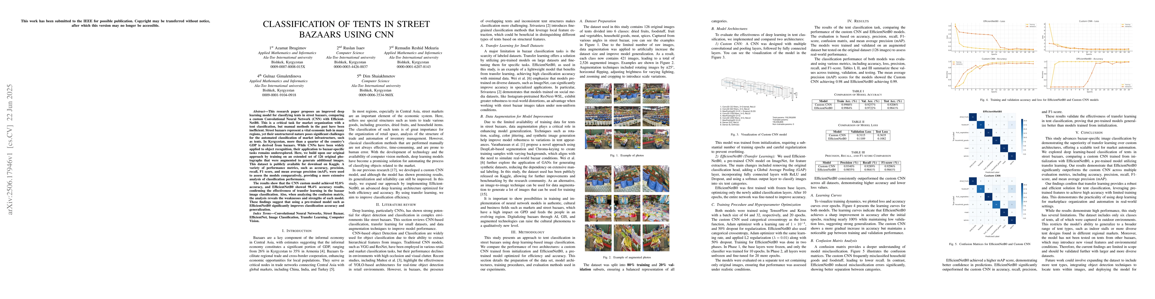 This research paper proposes an improved deep learning model for classifying tents in street bazaars, comparing a custom Convolutional Neural Network (CNN) with EfficientNetB0. This is a critical task for market organization with a tent classification, but manual methods in the past have been inefficient. Street bazaars represent a vital economic hub in many regions, yet their unstructured nature poses significant challenges for the automated classification of market infrastructure, such as tents. In Kyrgyzstan, more than a quarter of the country's GDP is derived from bazaars. While CNNs have been widely applied to object recognition, their application to bazaar-specific tasks remains underexplored. Here, we build upon our original approach by training on an extended set of 126 original photographs that were augmented to generate additional images. This dataset is publicly available for download on Kaggle. A variety of performance metrics, such as accuracy, precision, recall, F1 score, and mean average precision (mAP), were used to assess the models comparatively, providing a more extensive analysis of classification performance. The results show that the CNN custom model achieved 92.8% accuracy, and EfficientNetB0 showed 98.4% accuracy results, confirming the effectiveness of transfer learning in the bazaar image classification. Also, when analyzing the confusion matrix, the analysis reveals the weaknesses and strengths of each model. These findings suggest that using a pre-trained model such as EfficientNetB0 significantly improves classification accuracy and generalization.