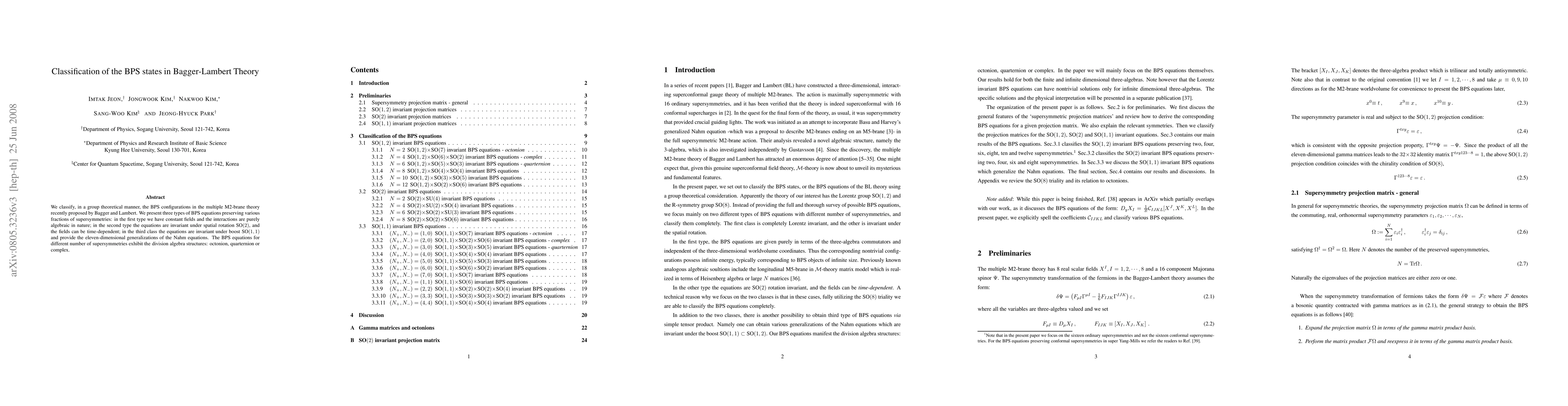 This paper classifies BPS states in Bagger-Lambert Theory through group theory, identifying three types of BPS equations based on varying supersymmetry preservation. The classifications reveal distinct algebraic, rotational, and boost invariant structures, with underlying division algebra features like octonions, quaternions, and complexes.
