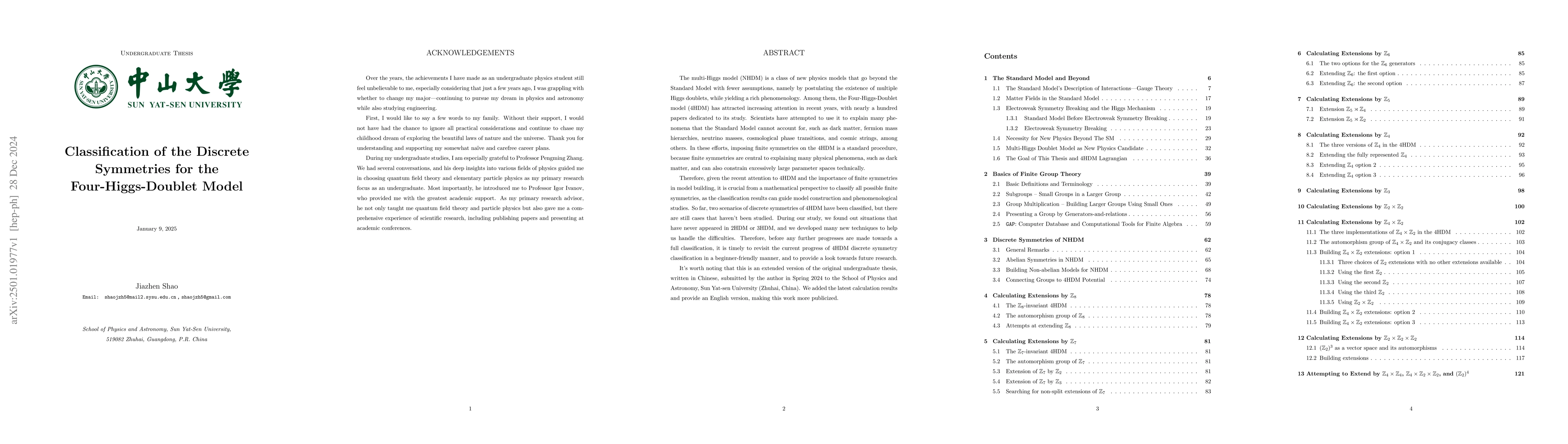 The multi-Higgs model (NHDM) is a class of new physics models that go beyond the Standard Model with fewer assumptions, namely by postulating the existence of multiple Higgs doublets, while yielding a rich phenomenology. Among them, the Four-Higgs-Doublet model (4HDM) has attracted increasing attention in recent years, with nearly a hundred papers dedicated to its study. Scientists have attempted to use it to explain many phenomena that the Standard Model cannot account for, such as dark matter, fermion mass hierarchies, neutrino masses, cosmological phase transitions, and cosmic strings, among others. In these efforts, imposing finite symmetries on the 4HDM is a standard procedure, because finite symmetries are central to explaining many physical phenomena, such as dark matter, and can also constrain excessively large parameter spaces technically. Therefore, given the recent attention to 4HDM and the importance of finite symmetries in model building, it is crucial from a mathematical perspective to classify all possible finite symmetries, as the classification results can guide model construction and phenomenological studies. So far, two scenarios of discrete symmetries of 4HDM have been classified, but there are still cases that haven't been studied. During our study, we found out situations that have never appeared in 2HDM or 3HDM, and we developed many new techniques to help us handle the difficulties. Therefore, before any further progresses are made towards a full classification, it is timely to revisit the current progress of 4HDM discrete symmetry classification in a beginner-friendly manner, and to provide a look towards future research.