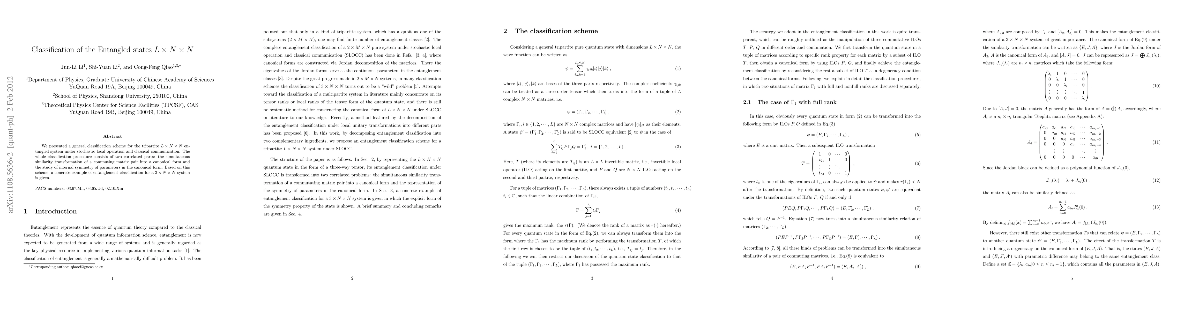 This paper proposes a classification scheme for $L\times N\times N$ tripartite entangled states under stochastic local operations and classical communication. The method involves transforming commuting matrices into a canonical form and analyzing internal symmetries, illustrated with a $3\times N\times N$ system example.