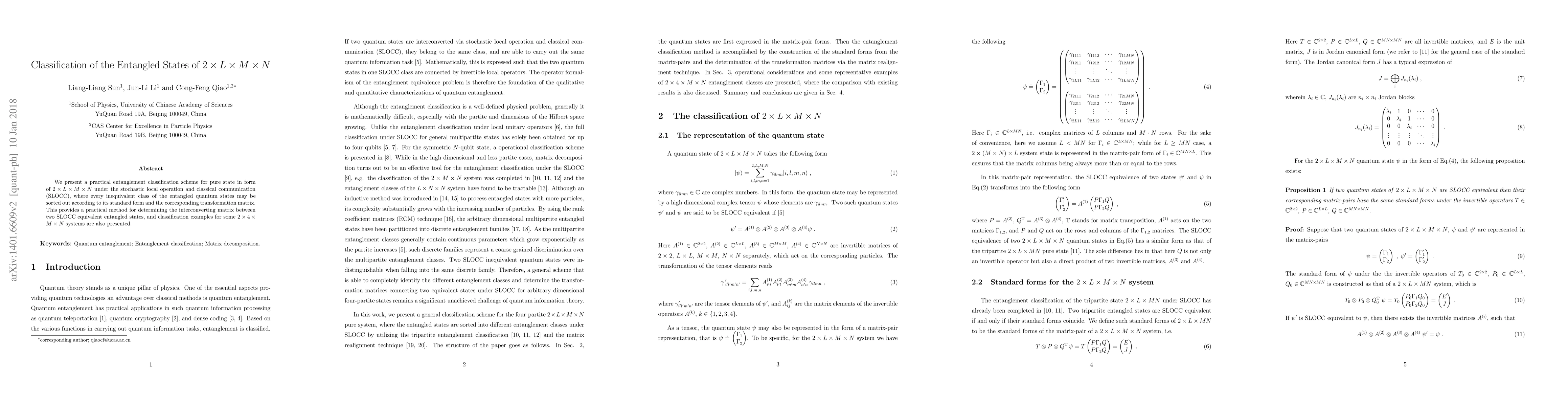 This paper proposes a method for classifying entangled quantum states of the form $2 \times L \times M \times N$ under SLOCC, providing a standard form for each inequivalent class and a transformation matrix for interconversion. Examples for $2 \times 4 \times M \times N$ systems are also discussed.