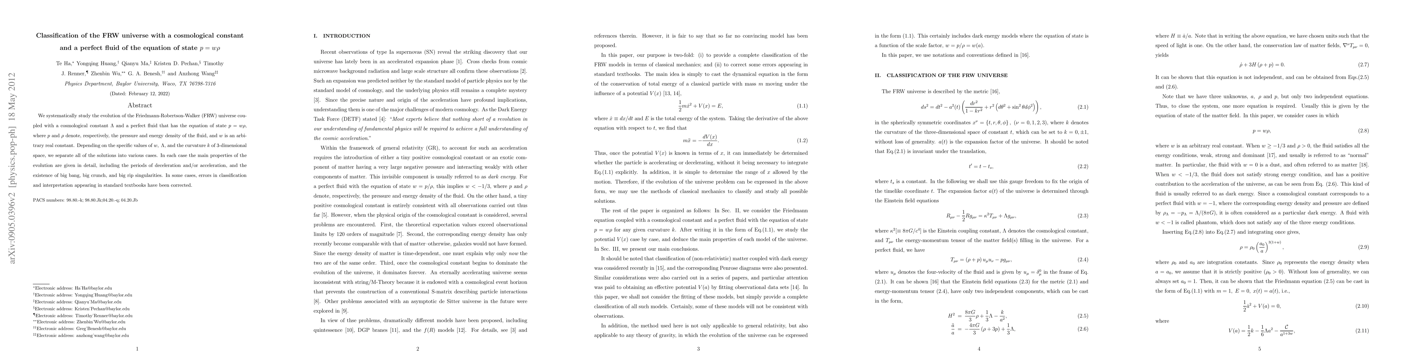 We systematically study the evolution of the Friedmann-Robertson-Walker (FRW) universe coupled with a cosmological constant $\Lambda$ and a perfect fluid that has the equation of state $p=w\rho$, where $p$ and $\rho$ denote, respectively, the pressure and energy density of the fluid, and $w$ is an arbitrary real constant. Depending on the specific values of $w,\; \Lambda$, and the curvature $k$ of 3-dimensional space, we separate all of the solutions into various cases. In each case the main properties of the evolution are given in detail, including the periods of deceleration and/or acceleration, and the existence of big bang, big crunch, and big rip singularities. In some cases, errors in classification and interpretation appearing in standard textbooks have been corrected.