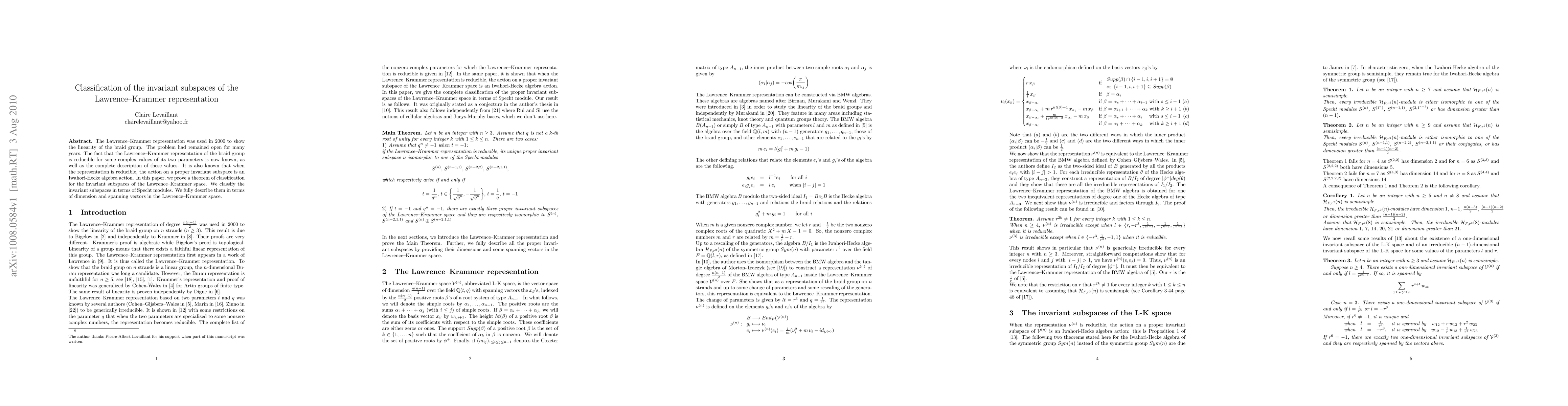 The Lawrence-Krammer representation was used in $2000$ to show the linearity of the braid group. The problem had remained open for many years. The fact that the Lawrence-Krammer representation of the braid group is reducible for some complex values of its two parameters is now known, as well as the complete description of these values under some restrictions on one of the parameters. It is also known that when the representation is reducible, the action on a proper invariant subspace is an Iwahori-Hecke algebra action. In this paper, we prove a theorem of classification for the invariant subspaces of the Lawrence-Krammer space. We classify the proper invariant subspaces in terms of Specht modules. We fully describe them in terms of dimension and spanning vectors in the Lawrence-Krammer space.