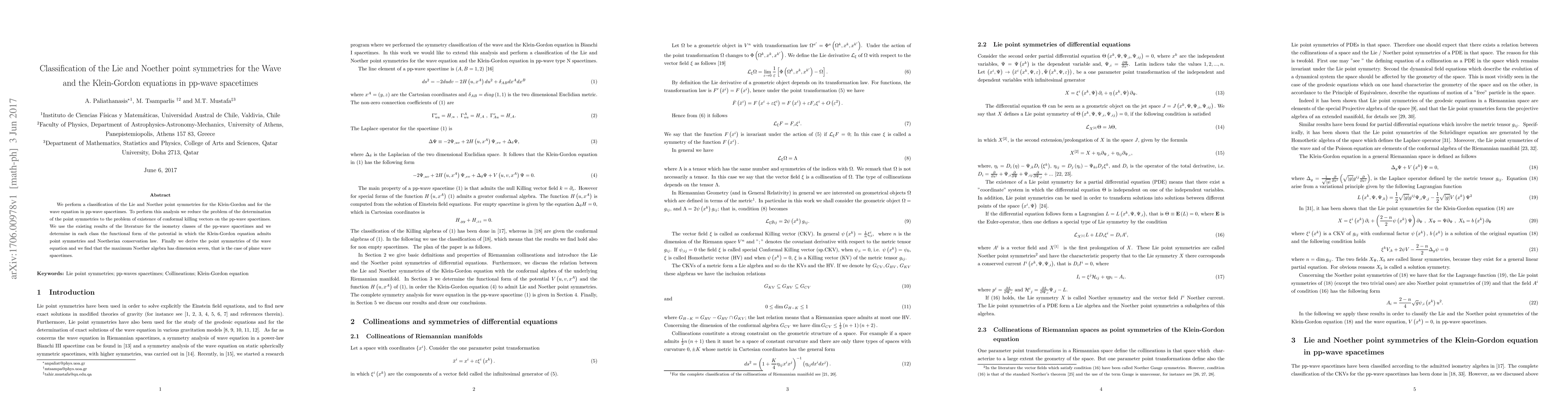 This paper classifies Lie and Noether point symmetries for the Klein-Gordon and wave equations in pp-wave spacetimes, linking symmetry determination to the existence of conformal Killing vectors. The study reveals the functional form of potentials admitting symmetries and conservation laws for the Klein-Gordon equation, and finds that the wave equation's maximum Noether algebra has dimension seven in plane wave spacetimes.