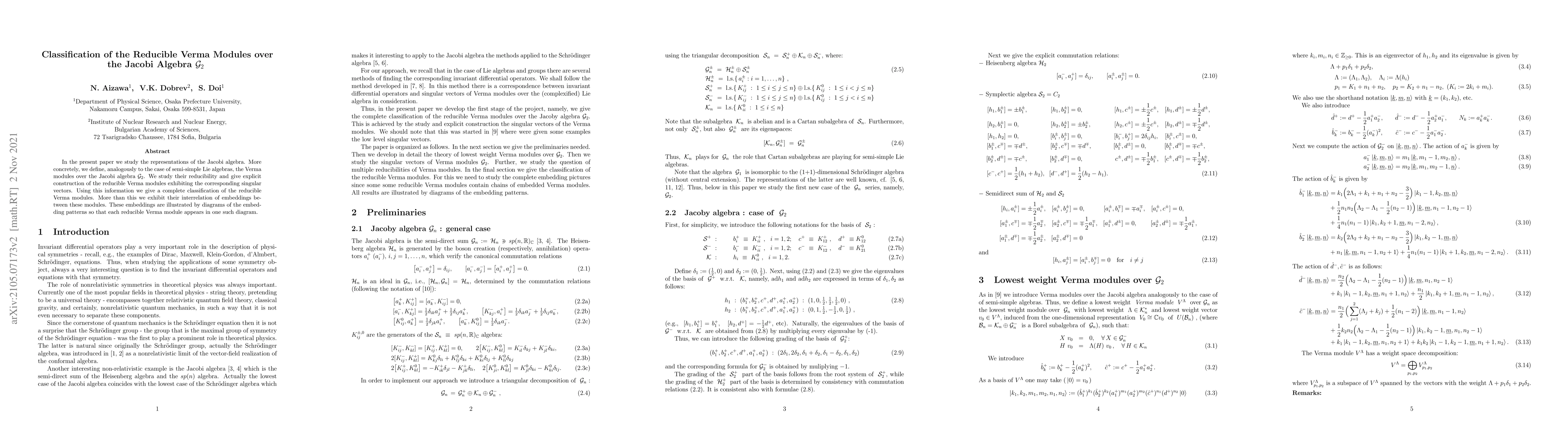 In the present paper we study the representations of the Jacobi algebra. More concretely, we define, analogously to the case of semi-simple Lie algebras, the Verma modules over the Jacobi algebra ${\cal G}_2$. We study their reducibility and give explicit construction of the reducible Verma modules exhibiting the corresponding singular vectors. Using this information we give a complete classification of the reducible Verma modules. More than this we exhibit their interrelation of embeddings between these modules. These embeddings are illustrated by diagrams of the embedding patterns so that each reducible Verma module appears in one such diagram.