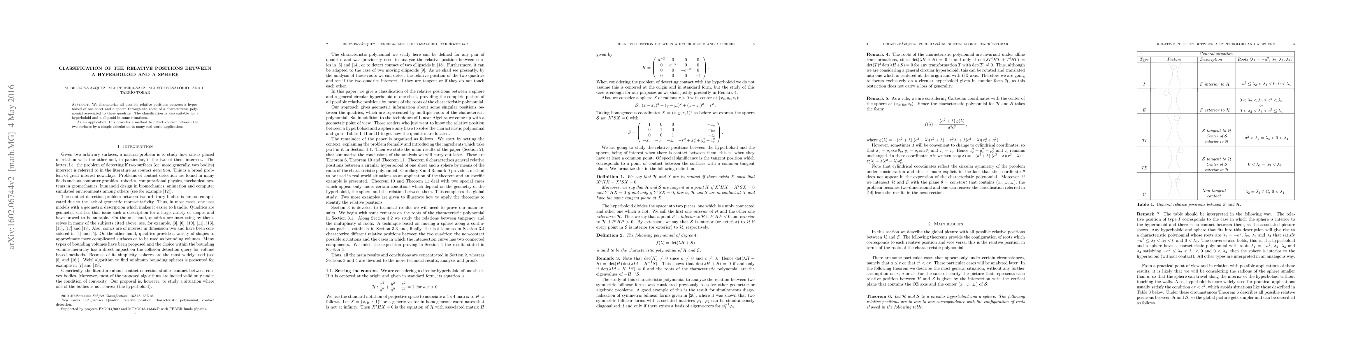 This paper classifies the relative positions between a hyperboloid of one sheet and a sphere using a characteristic polynomial, extending the method to ellipsoids in certain cases. It offers a practical application for detecting contact between these surfaces in real-world scenarios.