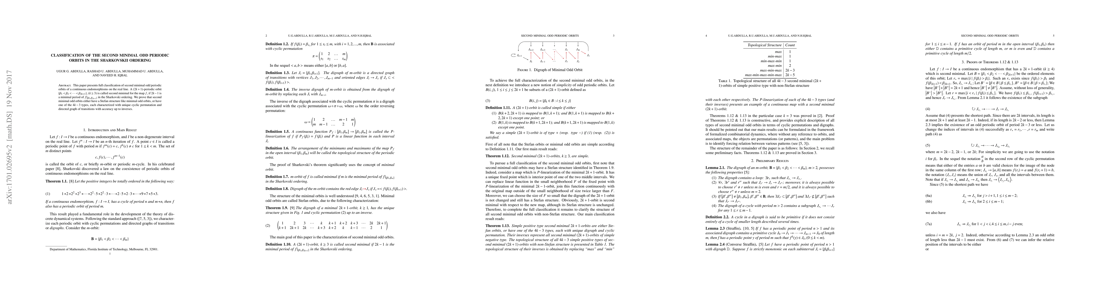 This paper classifies second minimal odd periodic orbits in the Sharkovskii ordering for continuous endomorphisms on the real line. It proves that there are $4k-3$ types of such $(2k+1)$-periodic orbits, each uniquely characterized by a cyclic permutation and directed graph of transitions.