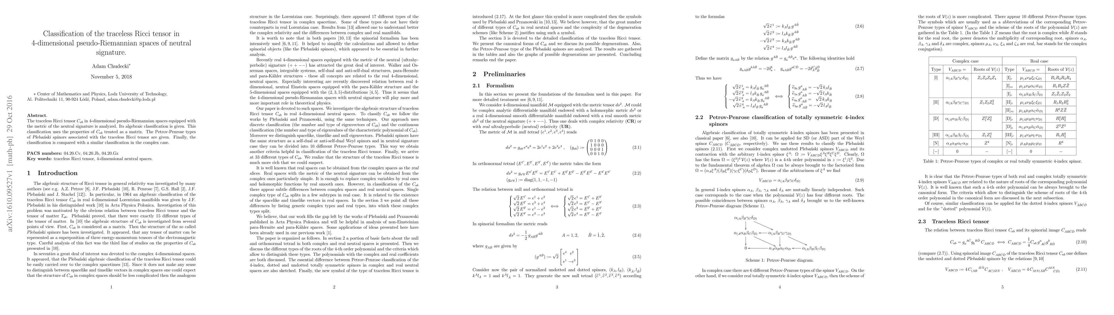 The traceless Ricci tensor $C_{ab}$ in 4-dimensional pseudo-Riemannian spaces equipped with the metric of the neutral signature is analyzed. Its algebraic classification is given. This classification uses the properties of $C_{ab}$ treated as a matrix. The Petrov-Penrose types of Pleba\'nski spinors associated with the traceless Ricci tensor are given. Finally, the classification is compared with a similar classification in the complex case.