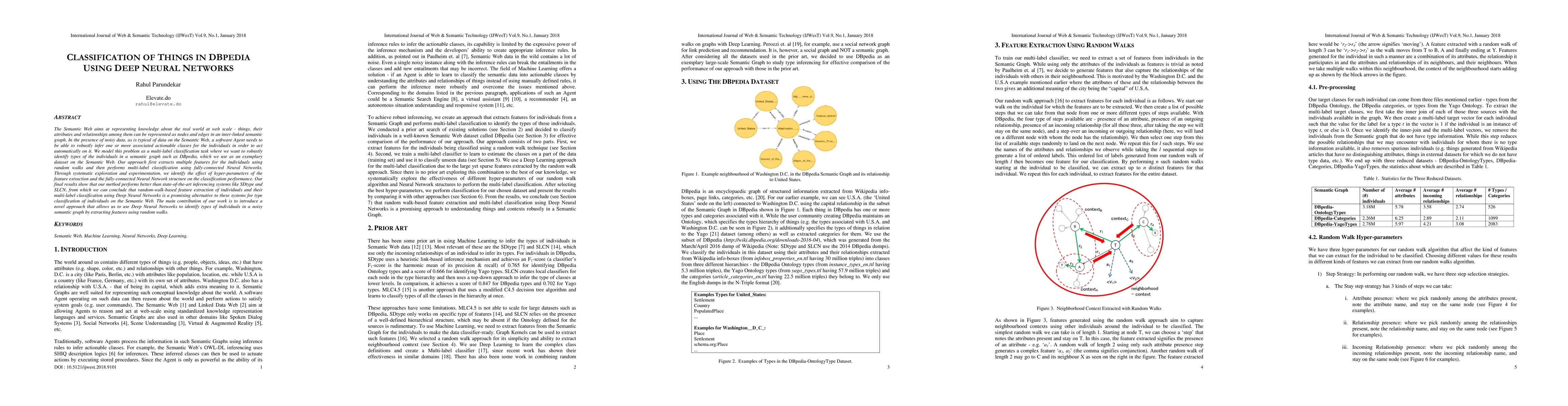 This paper proposes a novel method for classifying individuals in DBpedia using Deep Neural Networks, employing random walks for feature extraction and multi-label classification. The approach outperforms existing systems, demonstrating the effectiveness of this technique for type classification in noisy semantic graphs.