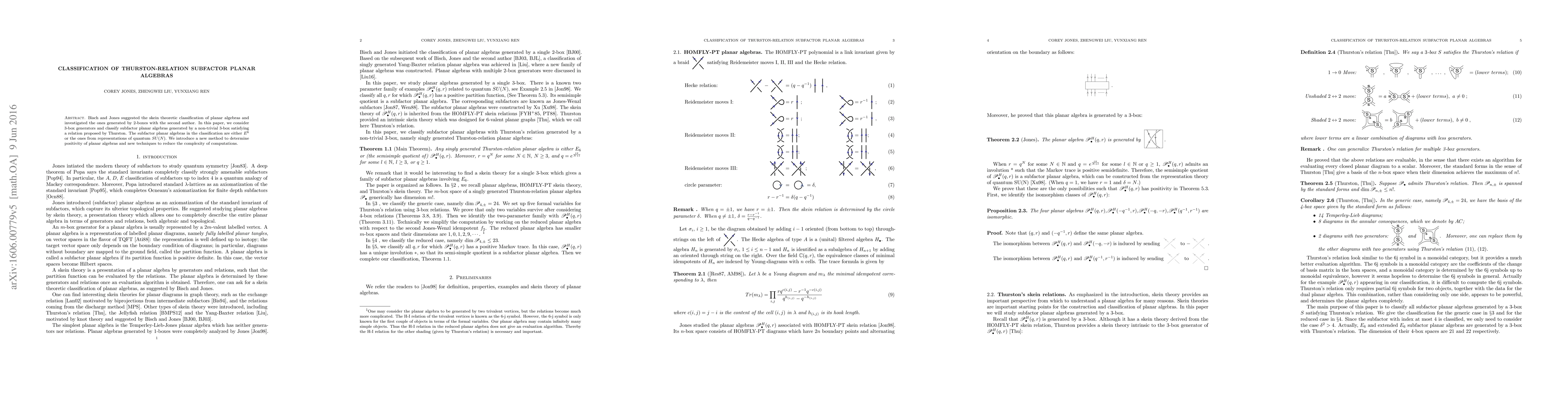 Bisch and Jones suggested the skein theoretic classification of planar algebras and investigated the ones generated by 2-boxes with the second author. In this paper, we consider 3-box generators and classify subfactor planar algebras generated by a non-trivial 3-box satisfying a relation proposed by Thurston. The subfactor planar algebras in the classification are either $E^6$ or the ones from representations of quantum $SU(N)$. We introduce a new method to determine positivity of planar algebras and new techniques to reduce the complexity of computations.