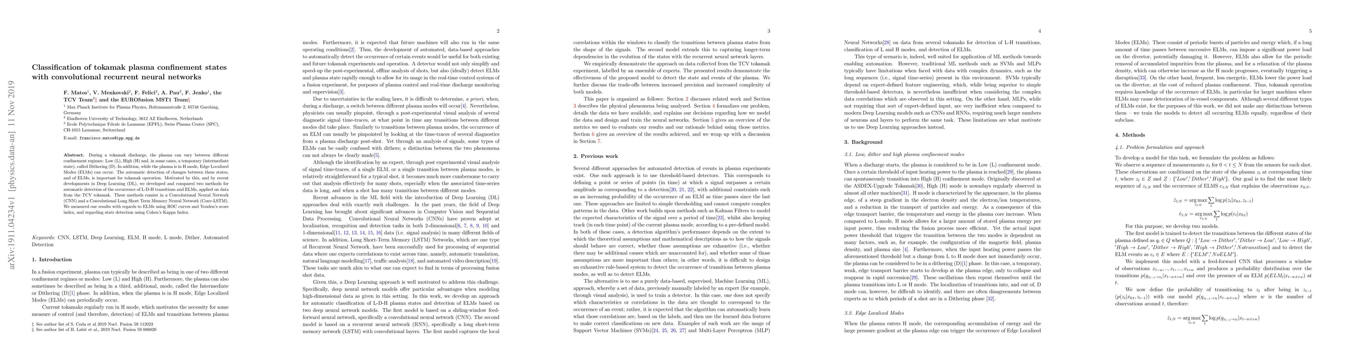 This paper explores the use of Convolutional Neural Networks (CNN) and Convolutional Long Short Term Memory Neural Networks (Conv-LSTM) for automatically detecting transitions between Low, High, and Dithering confinement states in tokamak plasma, as well as the occurrence of Edge Localized Modes (ELMs). The performance of these methods is evaluated using ROC curves, Youden's score index, and Cohen's Kappa Index.