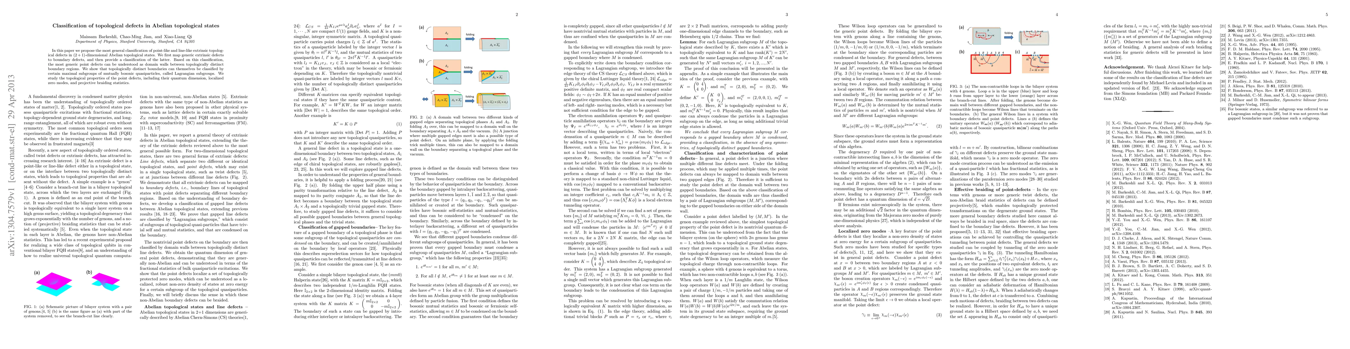 This paper proposes a comprehensive classification of point-like and line-like topological defects in Abelian topological states, demonstrating that these defects are essentially domain walls between topologically distinct boundary regions. The classification leverages maximal subgroups of mutually bosonic quasiparticles to categorize the boundaries and examines the topological properties of these defects.