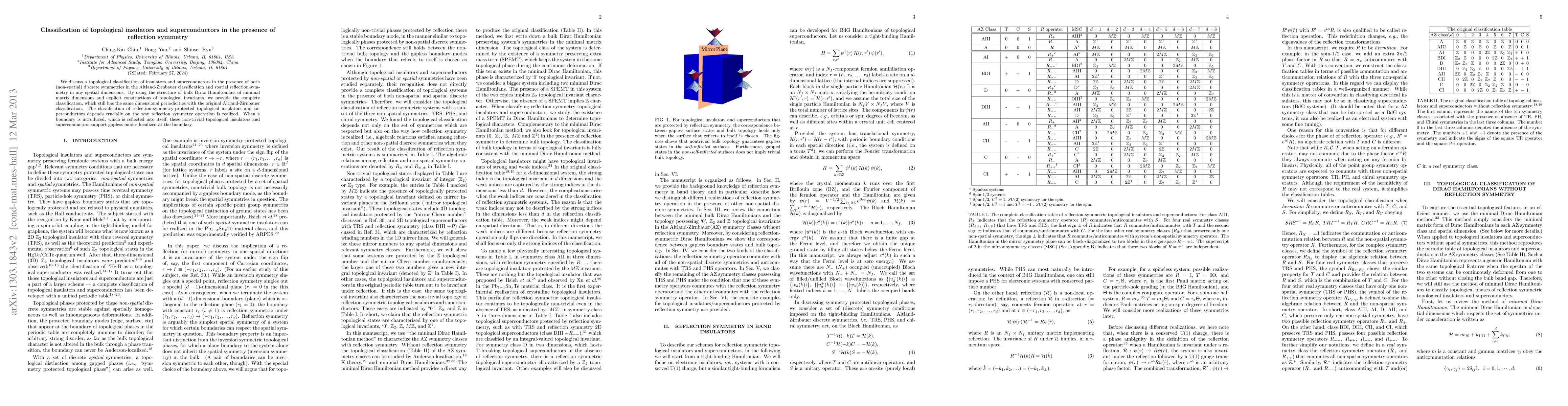 This paper classifies topological insulators and superconductors under reflection symmetry, combining discrete symmetries with spatial reflection. It provides a complete topological classification, revealing how reflection symmetry affects boundary states and gapless modes.