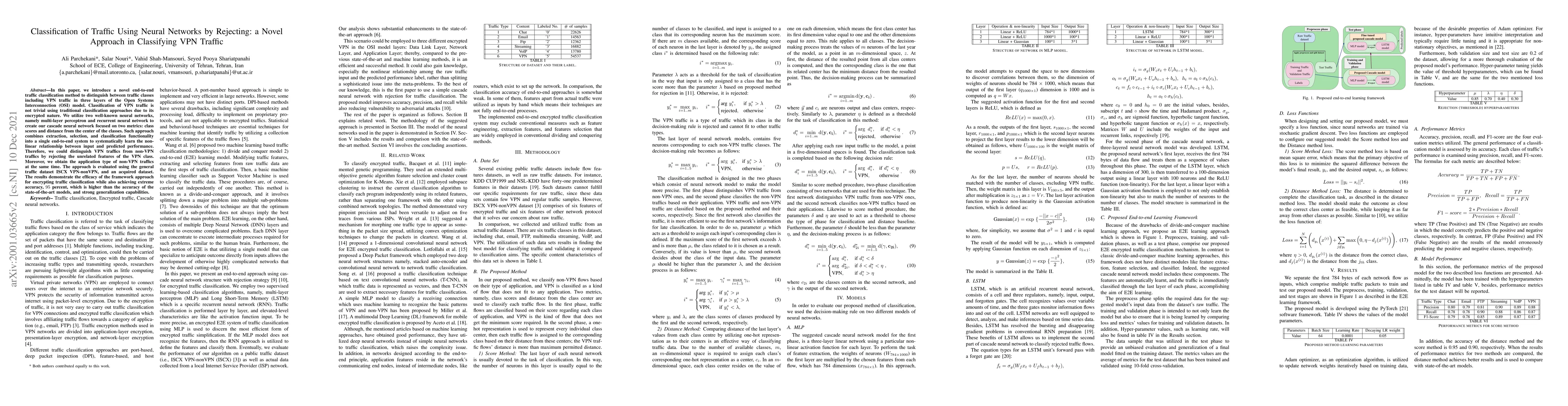 This paper presents a novel end-to-end neural network method for classifying encrypted VPN traffic using multi-layer perceptron and recurrent neural networks. The approach achieves high accuracy of 95% by rejecting unrelated features and distinguishing VPN traffic from non-VPN traffic.