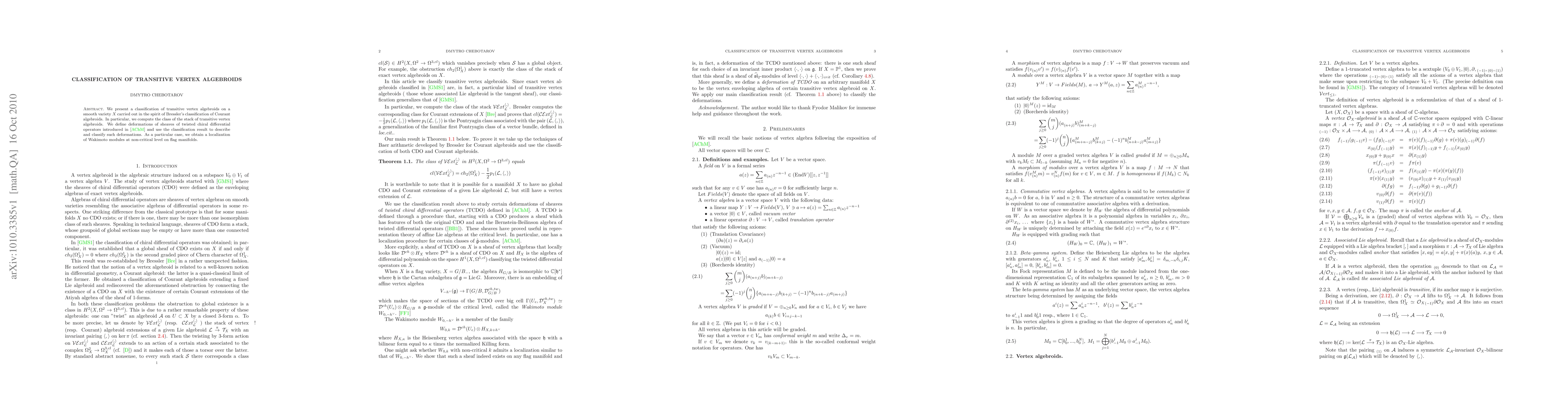 This paper classifies transitive vertex algebroids on smooth varieties, extending Bressler's classification of Courant algebroids. It introduces deformations of twisted chiral differential operators and applies the classification to describe and categorize these deformations, leading to the localization of Wakimoto modules on flag manifolds.