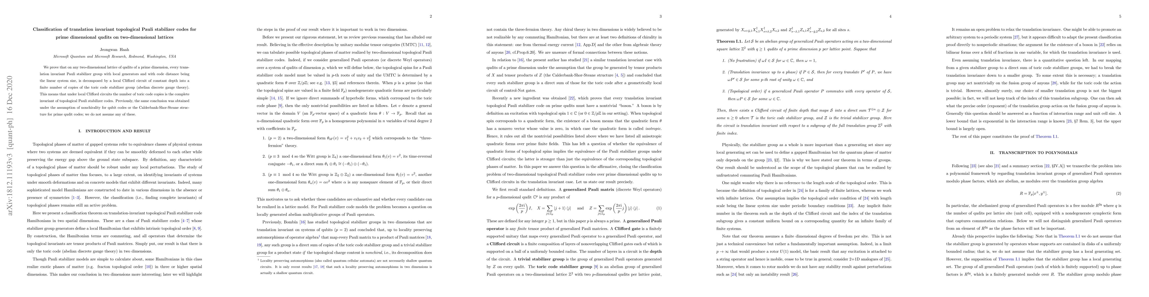 We prove that on any two-dimensional lattice of qudits of a prime dimension, every translation invariant Pauli stabilizer group with local generators and with code distance being the linear system size, is decomposed by a local Clifford circuit of constant depth into a finite number of copies of the toric code (abelian discrete gauge theory) stabilizer group. This means that under local Clifford circuits the number of toric code copies is the complete invariant of topological Pauli stabilizer codes. Previously, the same conclusion was obtained under the assumption of nonchirality for qubit codes or the Calderbank-Shor-Steane structure for prime qudit codes; we do not assume any of these.