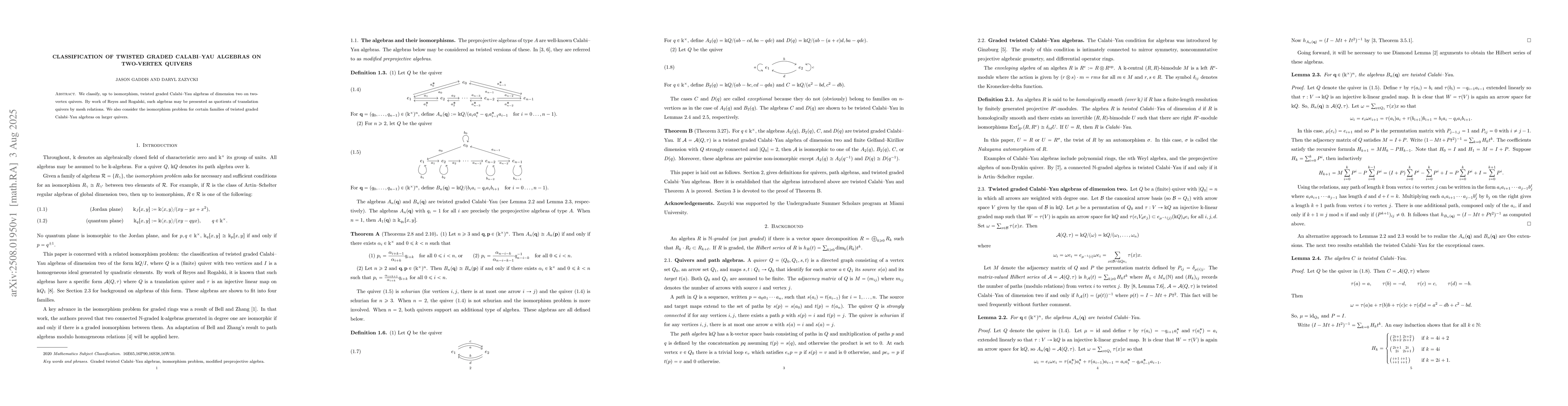 We classify, up to isomorphism, twisted graded Calabi--Yau algebras of dimension two on two-vertex quivers. By work of Reyes and Rogalski, such algebras may be presented as quotients of translation quivers by mesh relations. We also consider the isomorphism problem for certain families of twisted graded Calabi--Yau algebras on larger quivers.