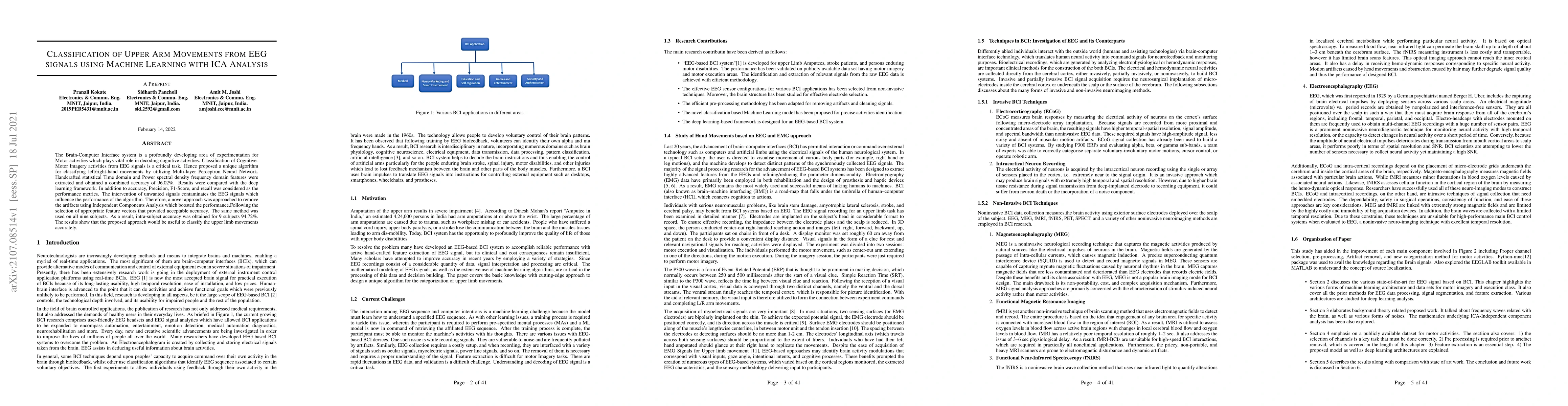 This paper proposes a machine learning algorithm using Multi-layer Perceptron Neural Networks to classify upper arm movements from EEG signals, achieving a high accuracy of 96.02%. Independent Components Analysis is used to remove artifacts, enhancing the classification performance and resulting in an intra-subject accuracy of 94.72%.