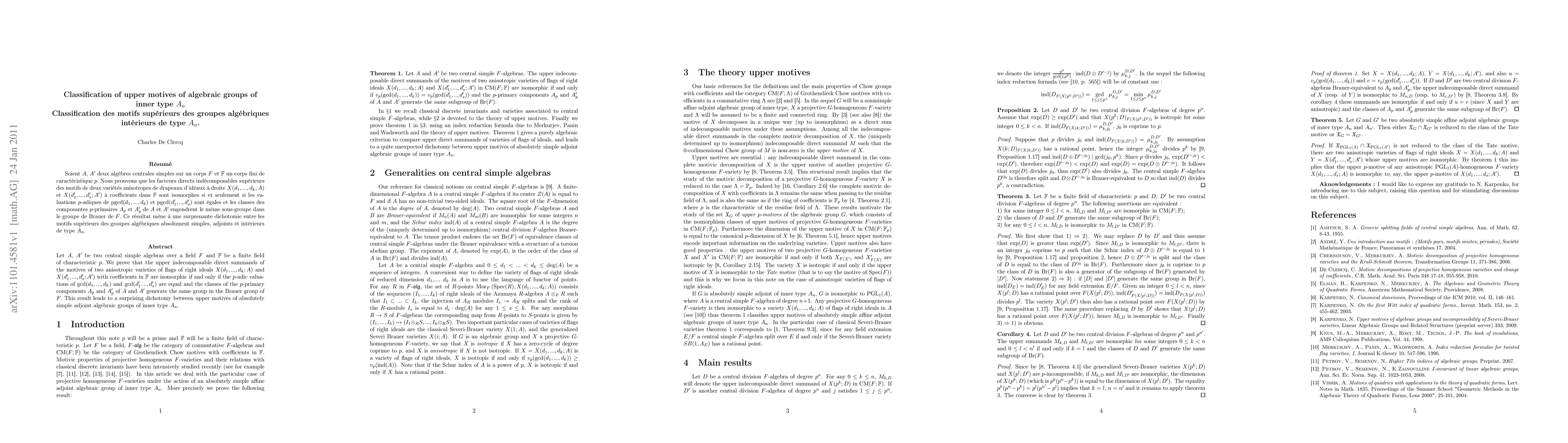 Let A, A' be two central simple algebras over a field F and \mathbb{F} be a finite field of characteristic p. We prove that the upper indecomposable direct summands of the motives of two anisotropic varieties of flags of right ideals X(d_1,...,d_k;A) and X(d'_1,...,d'_s;A') with coefficients in \mathbb{F} are isomorphic if and only if the p-adic valuations of gcd(d_1,...,d_k) and gcd(d'_1,..,d'_s) are equal and the classes of the p-primary components A_p and A'_p of A and A' generate the same group in the Brauer group of F. This result leads to a surprising dichotomy between upper motives of absolutely simple adjoint algebraic groups of inner type A_n