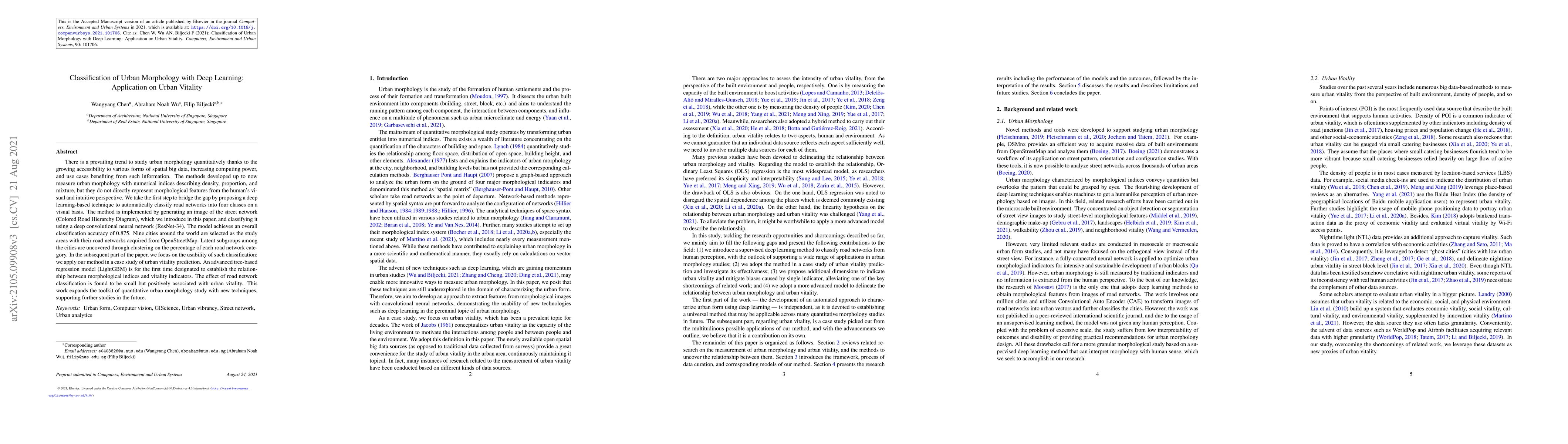 A new deep learning technique automatically classifies road networks into four classes based on visual appearance, achieving an accuracy of 0.875. The method is used to predict urban vitality with mixed results, but expands the toolkit for quantitative urban morphology study.