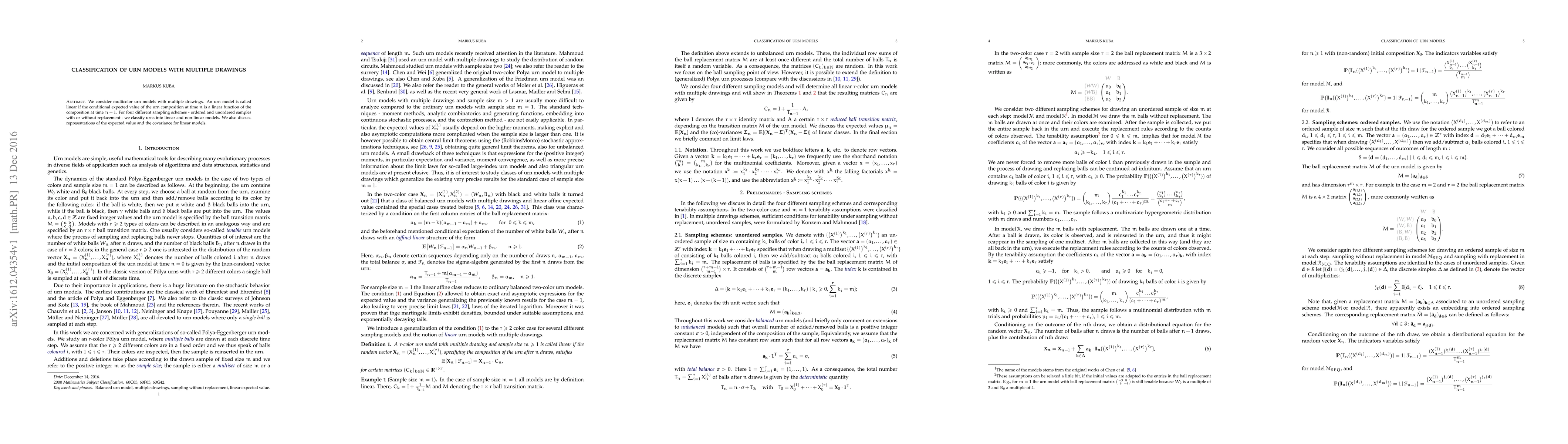 This paper classifies multicolor urn models with multiple drawings into linear and non-linear categories based on four sampling schemes: ordered and unordered samples with replacement. It also discusses representations of expected value and covariance for linear models.