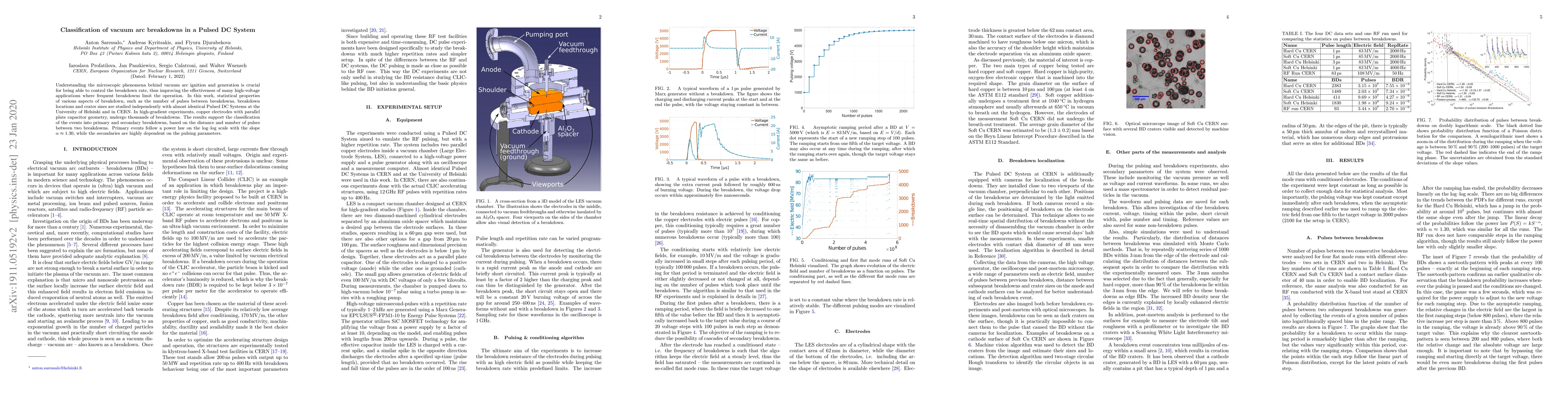 The study utilized pulsed DC systems at the University of Helsinki and CERN to analyze statistical properties of vacuum arc breakdowns, including pulse intervals, locations, and crater sizes in high-gradient experiments with copper electrodes.