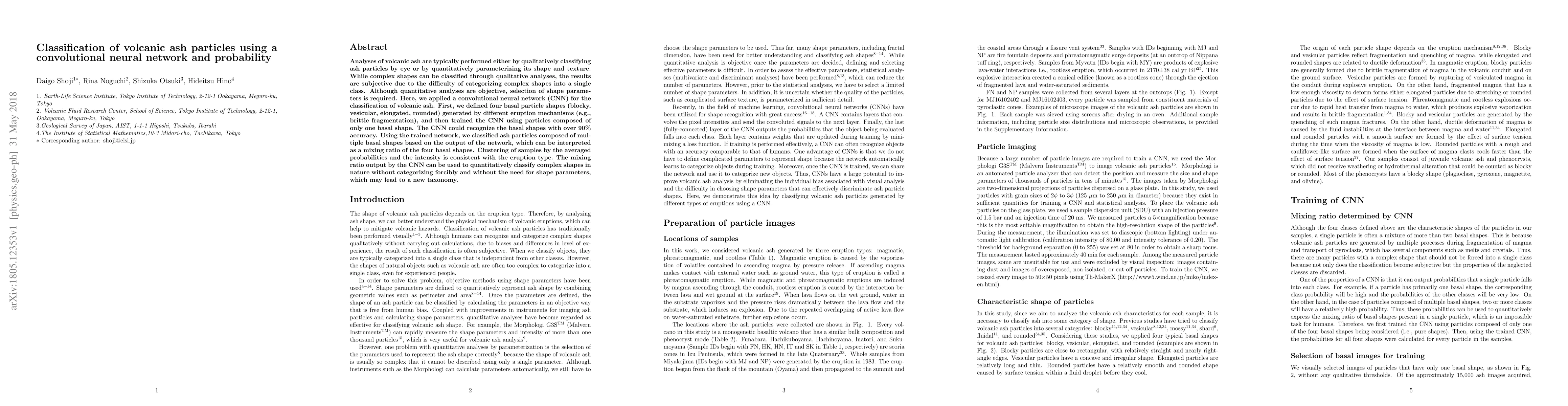 This paper uses a convolutional neural network (CNN) to classify volcanic ash particles into four basal shapes (blocky, vesicular, elongated, rounded) based on their eruption mechanisms. The CNN achieved over 90% accuracy in recognizing these shapes, enabling a new method for classifying complex ash particles without subjective categorization or the need for shape parameters.