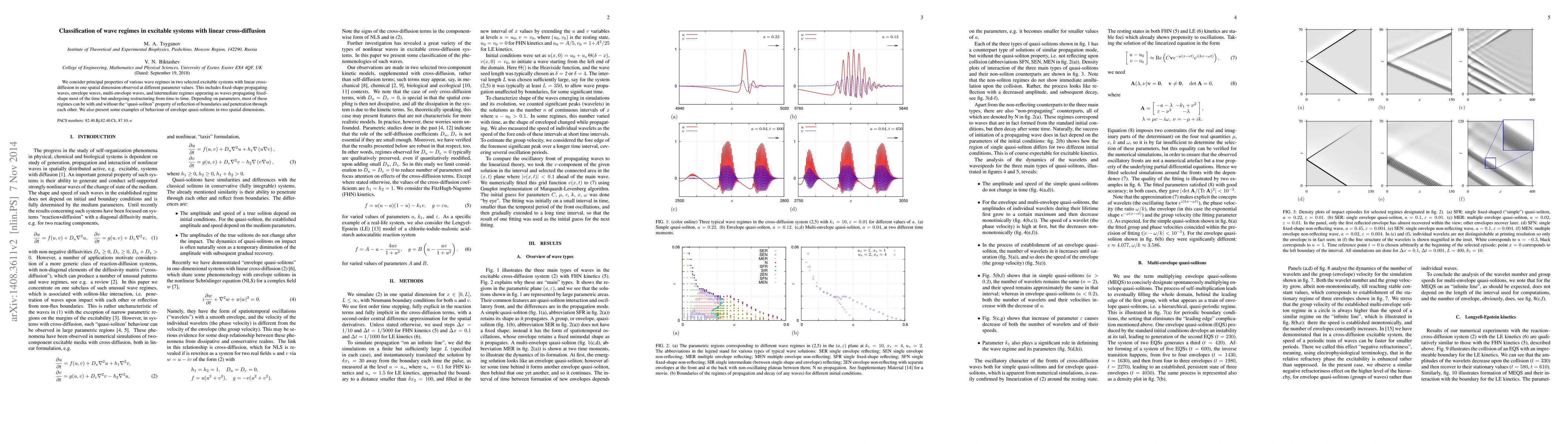 This paper classifies different wave regimes in excitable systems with linear cross-diffusion, including fixed-shape waves, envelope waves, and multi-envelope waves, and explores their behavior under varying parameters, highlighting the presence or absence of quasi-soliton properties. Examples of quasi-soliton behavior in two dimensions are also discussed.