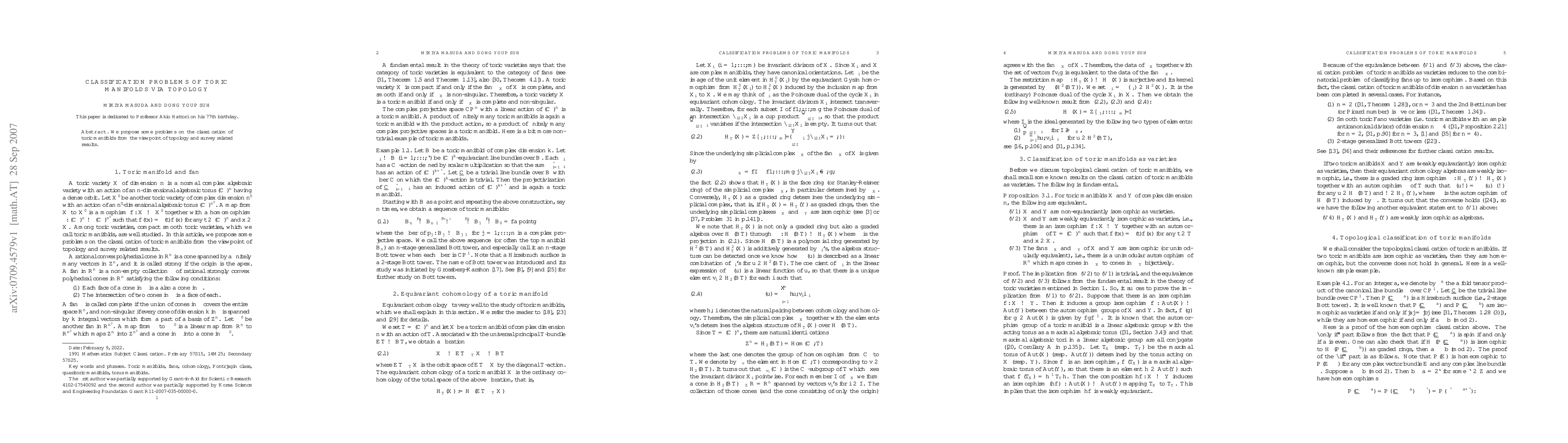 Summary: This paper explores classification problems of toric manifolds through topological methods and reviews existing findings in this area. The focus is on understanding the topological properties that distinguish different toric manifolds.