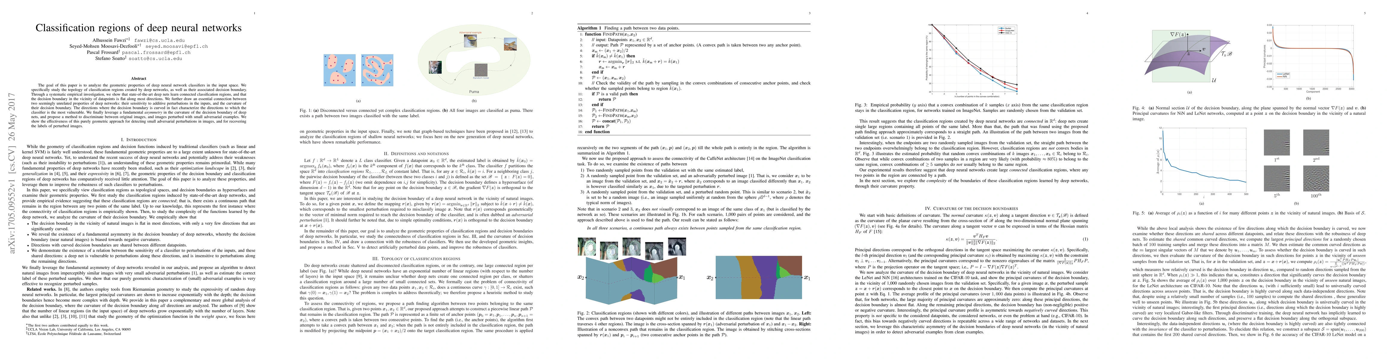 This paper investigates the geometric properties of deep neural networks' classification regions and decision boundaries, revealing that deep networks create connected regions with flat decision boundaries in most directions. It also links the network's sensitivity to input perturbations with the curvature of its decision boundary, proposing a geometric method to detect and recover from small adversarial perturbations.