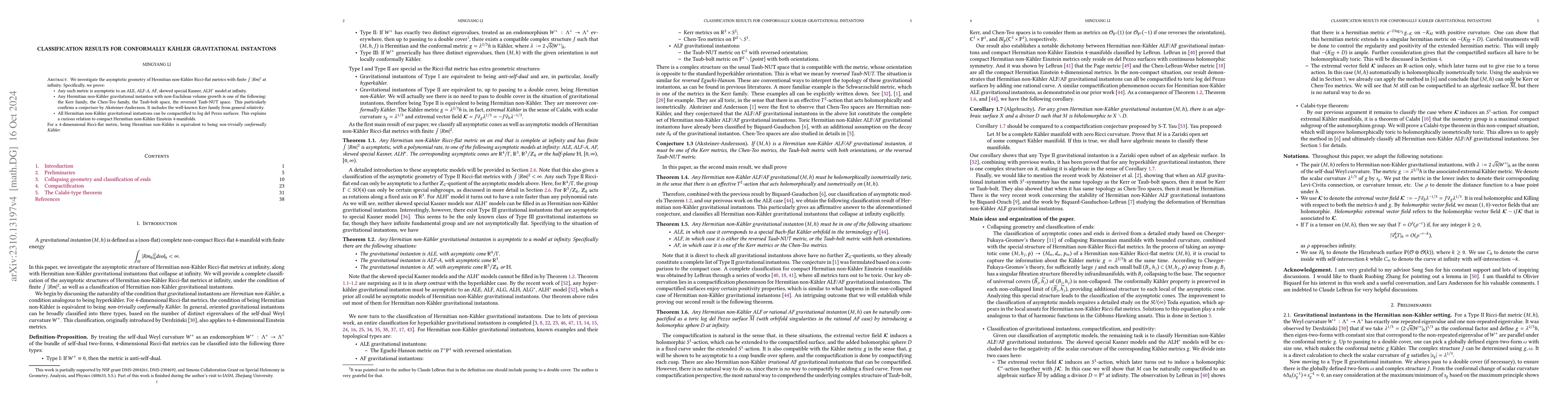 This paper classifies Hermitian non-Kähler ALF/AF gravitational instantons, confirming a conjecture and showing their compactification to toric log del Pezzo surfaces, while proving the non-existence of ALG and ALH type instantons.