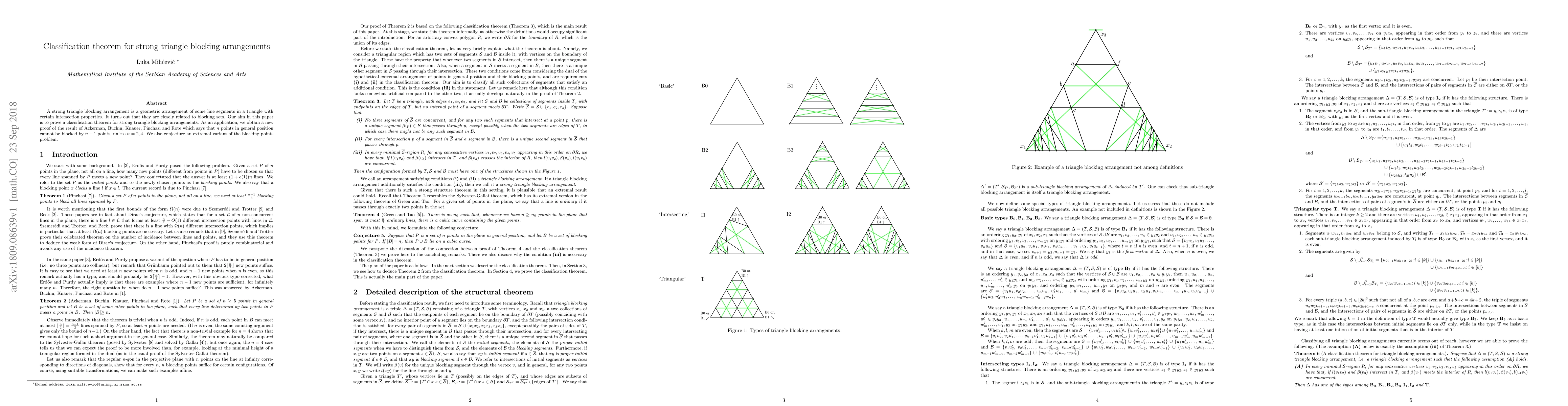 A strong triangle blocking arrangement is a geometric arrangement of some line segments in a triangle with certain intersection properties. It turns out that they are closely related to blocking sets. Our aim in this paper is to prove a classification theorem for strong triangle blocking arrangements. As an application, we obtain a new proof of the result of Ackerman, Buchin, Knauer, Pinchasi and Rote which says that $n$ points in general position cannot be blocked by $n-1$ points, unless $n = 2,4$. We also conjecture an extremal variant of the blocking points problem.