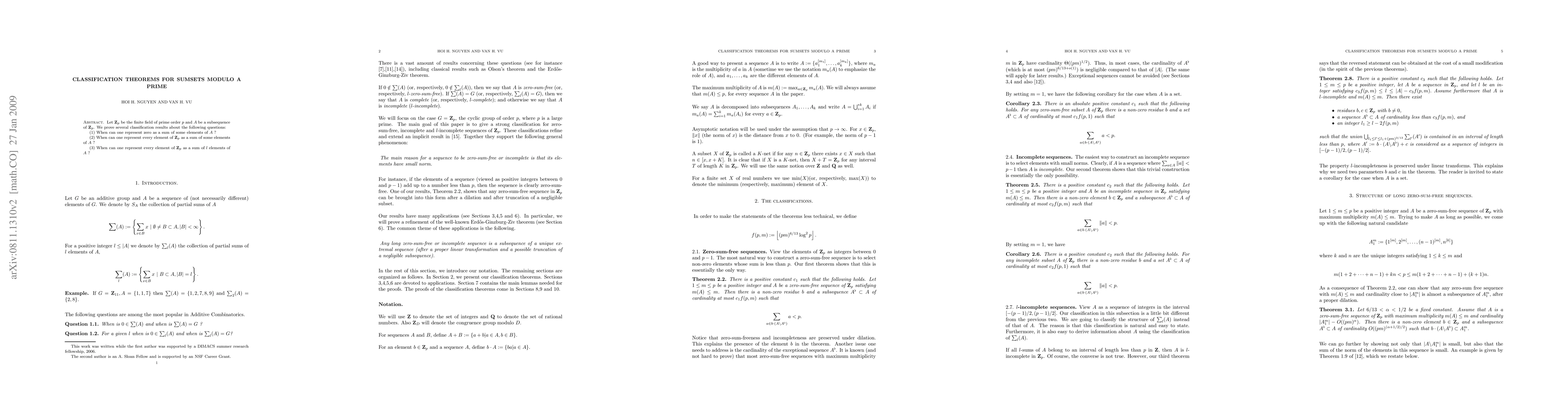 Let $\Z/pZ$ be the finite field of prime order $p$ and $A$ be a subsequence of $\Z/pZ$. We prove several classification results about the following questions: (1) When can one represent zero as a sum of some elements of $A$ ? (2) When can one represent every element of $\Z/pZ$ as a sum of some elements of $A$ ? (3) When can one represent every element of $\Z/pZ$ as a sum of $l$ elements of $A$ ?