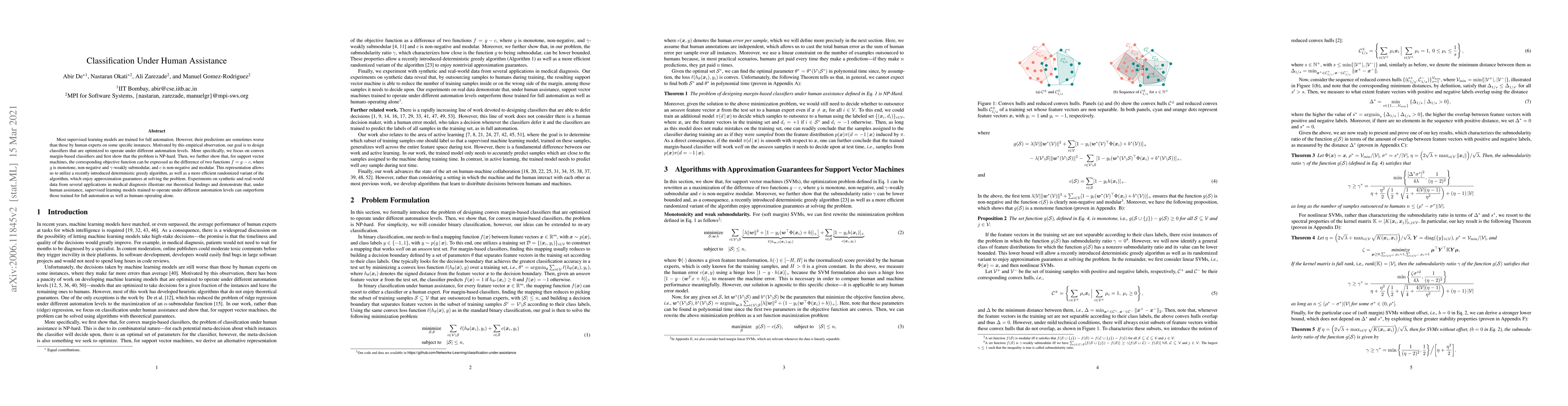 Most supervised learning models are trained for full automation. However, their predictions are sometimes worse than those by human experts on some specific instances. Motivated by this empirical observation, our goal is to design classifiers that are optimized to operate under different automation levels. More specifically, we focus on convex margin-based classifiers and first show that the problem is NP-hard. Then, we further show that, for support vector machines, the corresponding objective function can be expressed as the difference of two functions f = g - c, where g is monotone, non-negative and {\gamma}-weakly submodular, and c is non-negative and modular. This representation allows a recently introduced deterministic greedy algorithm, as well as a more efficient randomized variant of the algorithm, to enjoy approximation guarantees at solving the problem. Experiments on synthetic and real-world data from several applications in medical diagnosis illustrate our theoretical findings and demonstrate that, under human assistance, supervised learning models trained to operate under different automation levels can outperform those trained for full automation as well as humans operating alone.