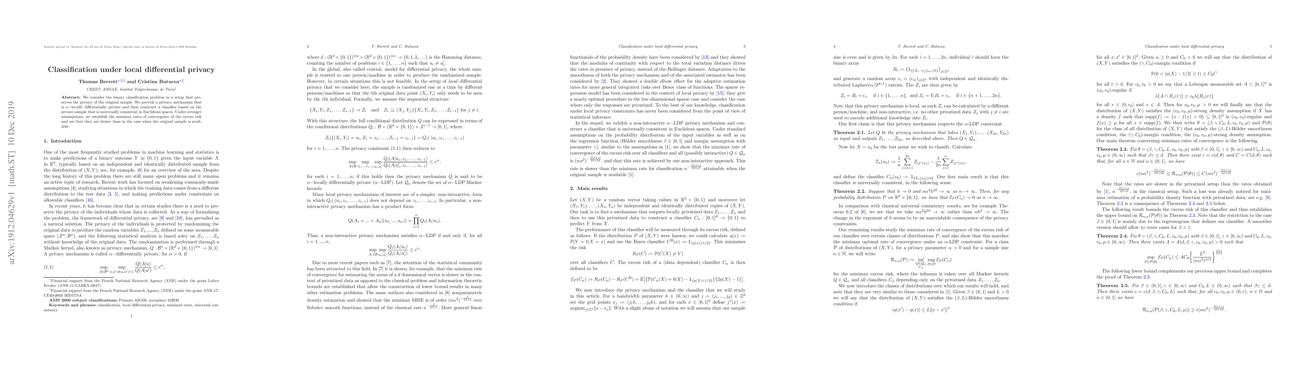 We consider the binary classification problem in a setup that preserves the privacy of the original sample. We provide a privacy mechanism that is locally differentially private and then construct a classifier based on the private sample that is universally consistent in Euclidean spaces. Under stronger assumptions, we establish the minimax rates of convergence of the excess risk and see that they are slower than in the case when the original sample is available.