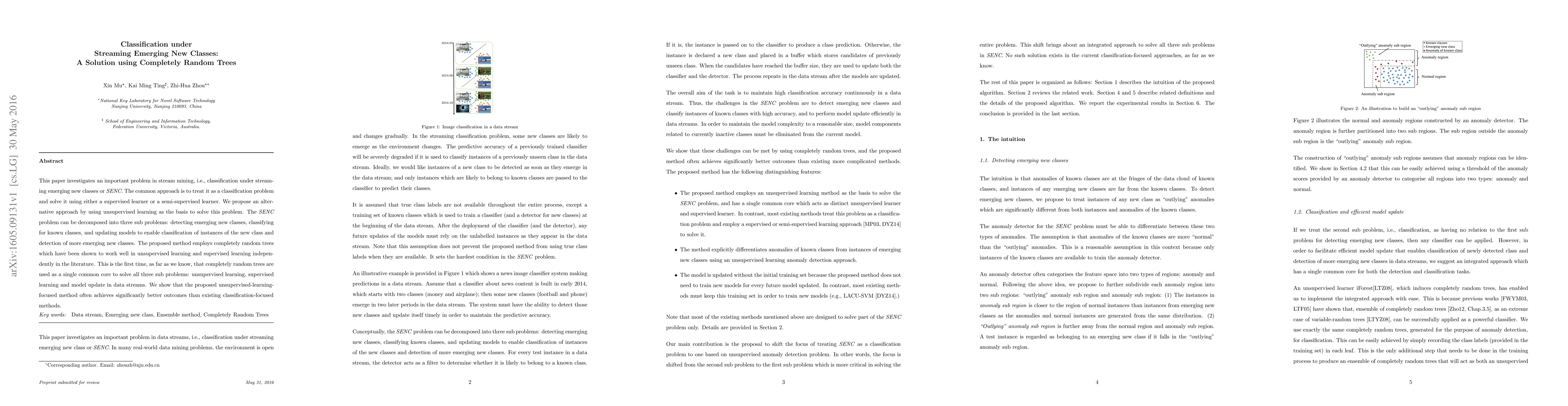 This paper proposes an unsupervised learning approach using completely random trees to tackle the classification under streaming emerging new classes (SENC) problem, achieving better outcomes than existing classification-focused methods. The method addresses emerging new classes detection, known class classification, and model updates through a unified framework.